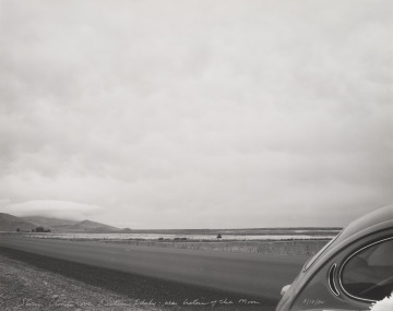 Storm clouds fill the wide sky, and mountains rise out of the distance in this photograph taken near Idaho’s Craters of the Moon National Monument. The road trip itself is the subject of the image. The destination referenced in the title is not visible, while the artist’s vehicle, a Volkswagen Beetle, appears in the corner as a kind of self-portrait. Mark Klett calls attention to the object qualities of this photograph as well, handwriting the title and date in silver ink and allowing the gelatin emulsion at the bottom right to peel away.
