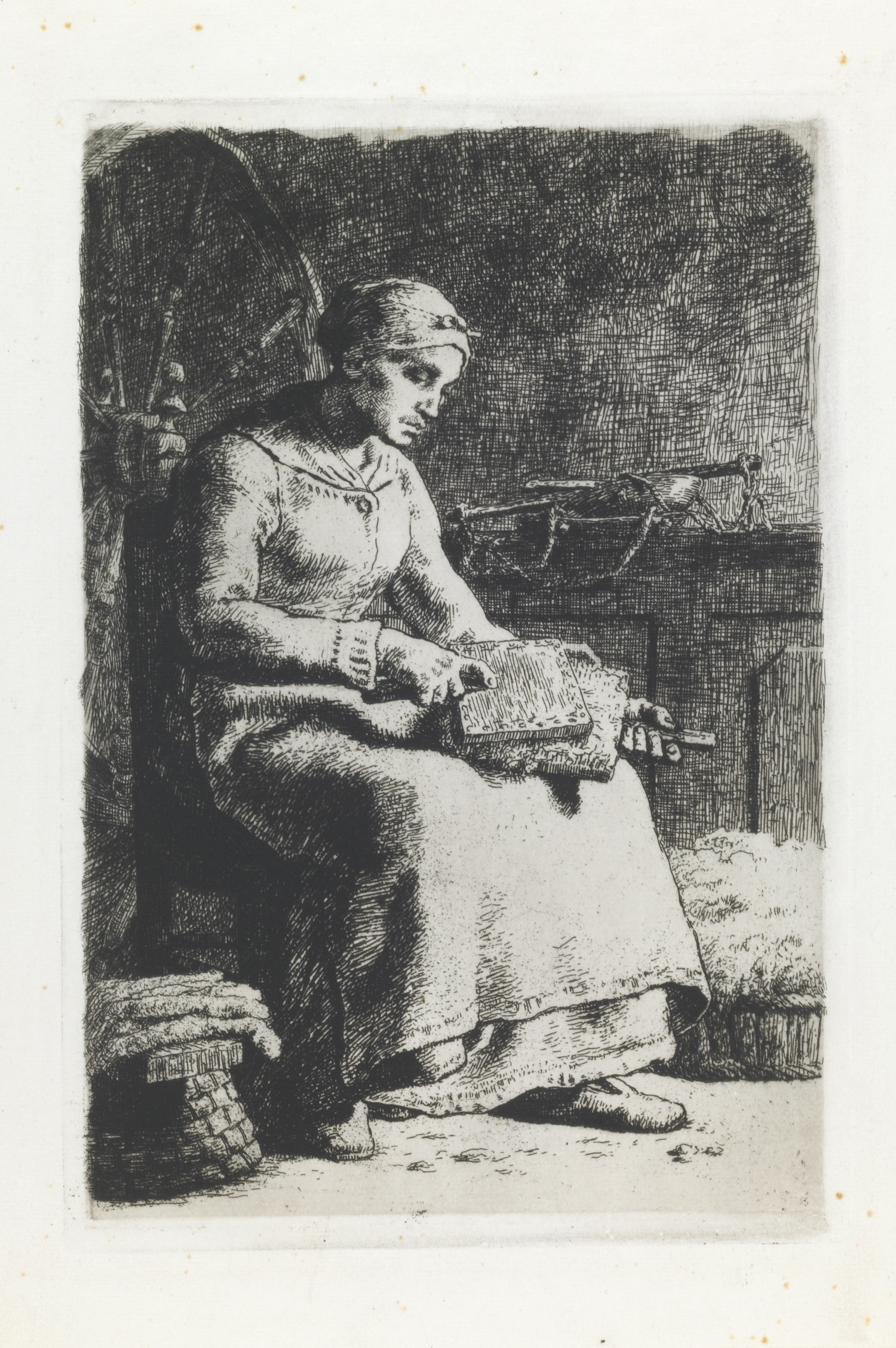 This etching, considered to be one of Jean-François Millet's finest, empathetically depicts a peasant working at the lowest level of the wool business. She fills most of the picture, intent upon the rhythmic stroking of the toothed paddles that comb and clean wool fibers before they are spun. Surrounding her are objects of her trade: baskets heaped with both raw and finished wool, a spinning wheel, and a scale for weighing. In her posture and facial expression, we sense a weariness and resignation.