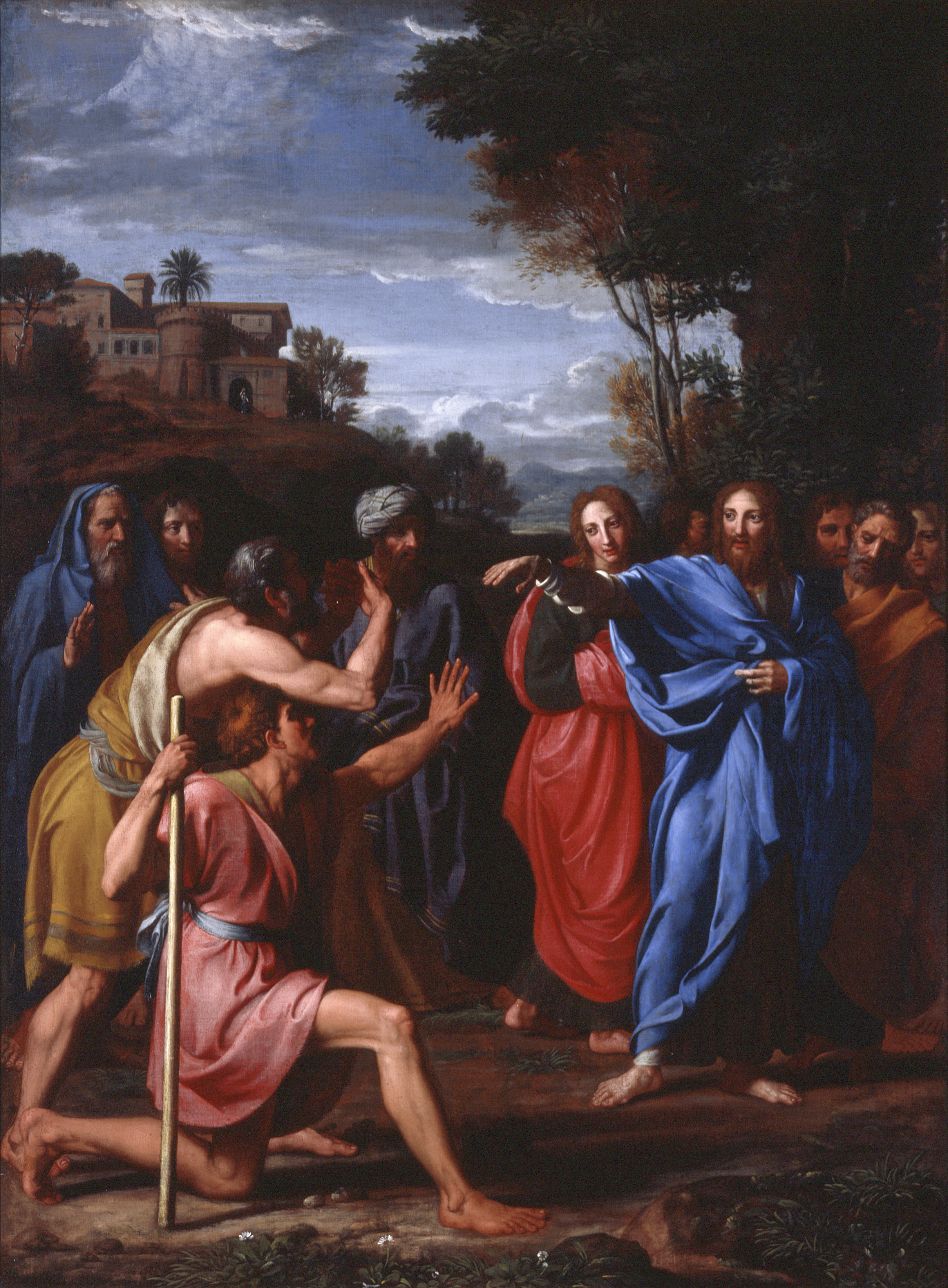 On the left side of this composition, two men react dramatically to regaining their vision. One looks at his own hand, as if for the first time. The other pulls his arm back, having just made contact with Jesus. By contrasting the dark forms of the landscape with the bright, luminous sky, Nicolas Colombel provided a metaphor for the light of vision breaking through the shadow of blindness. To highlight the figure of Jesus, Colombel set his rich blue drapery against the saturated red robe of St. John the Evangelist.