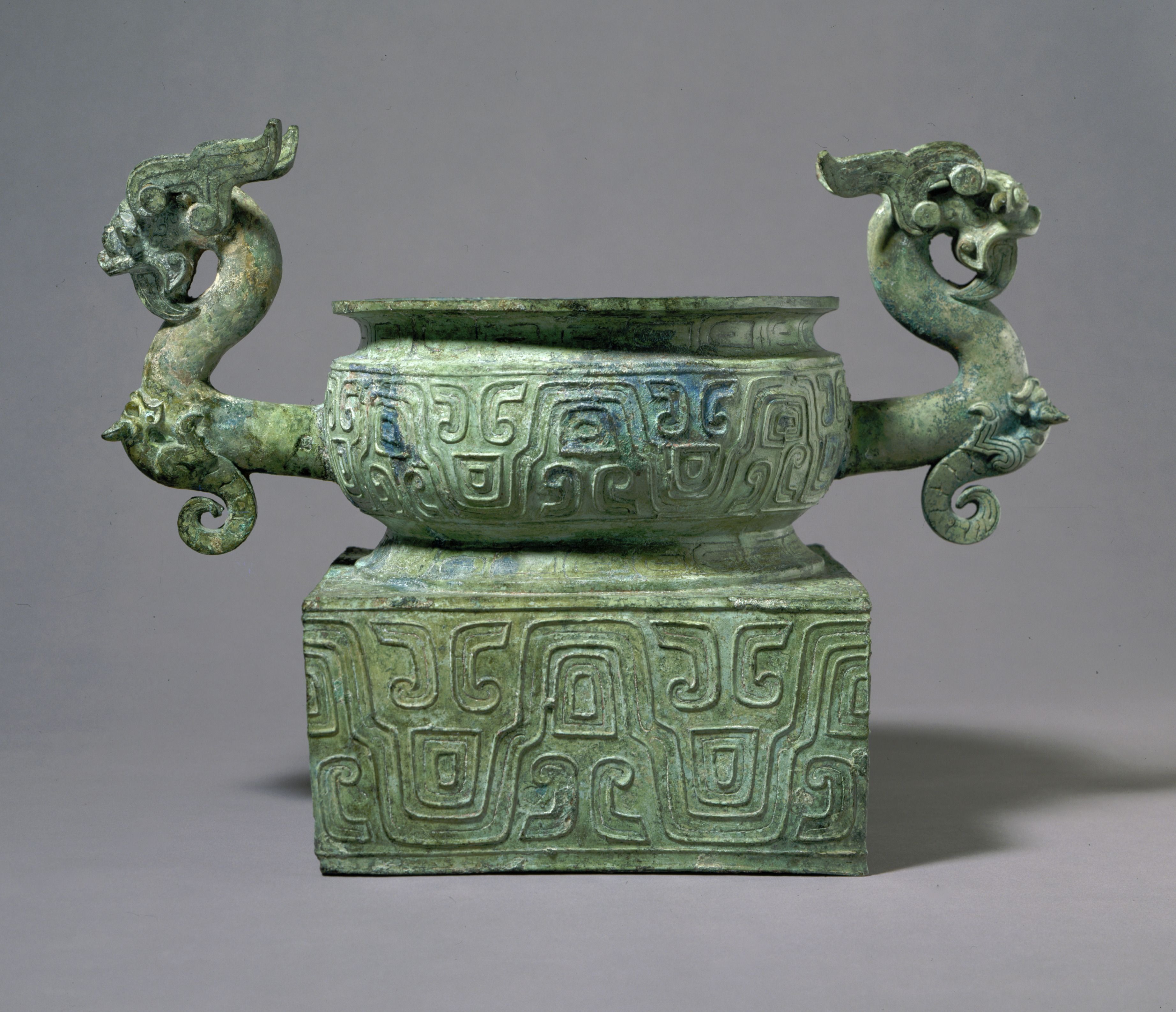 This covered food container was originally part of a set of eight identical ritual bronzes, six of which have survived. The exuberant, rampant dragons on this impressive ritual bronze vessel were once enhanced by an elaborate cover. Like this bronze, each of the five other vessels features a simplified version of the wave pattern. In this vessel the wave is reduced to a line in low relief and is invigorated by the drama of these flamboyant dragons with their flowing manes and sinuous, snakelike bodies. The cover was ringed with eight flaring, openwork petals and the same rhythmic pattern found on the round vessel and its square base.