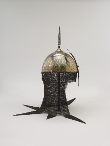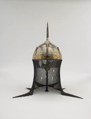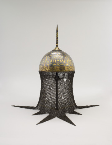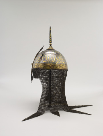 Cap Helmet (kulah khud) with Design of Interlaced Vines, Arabic Inscriptions, and Mail Neck Curtain