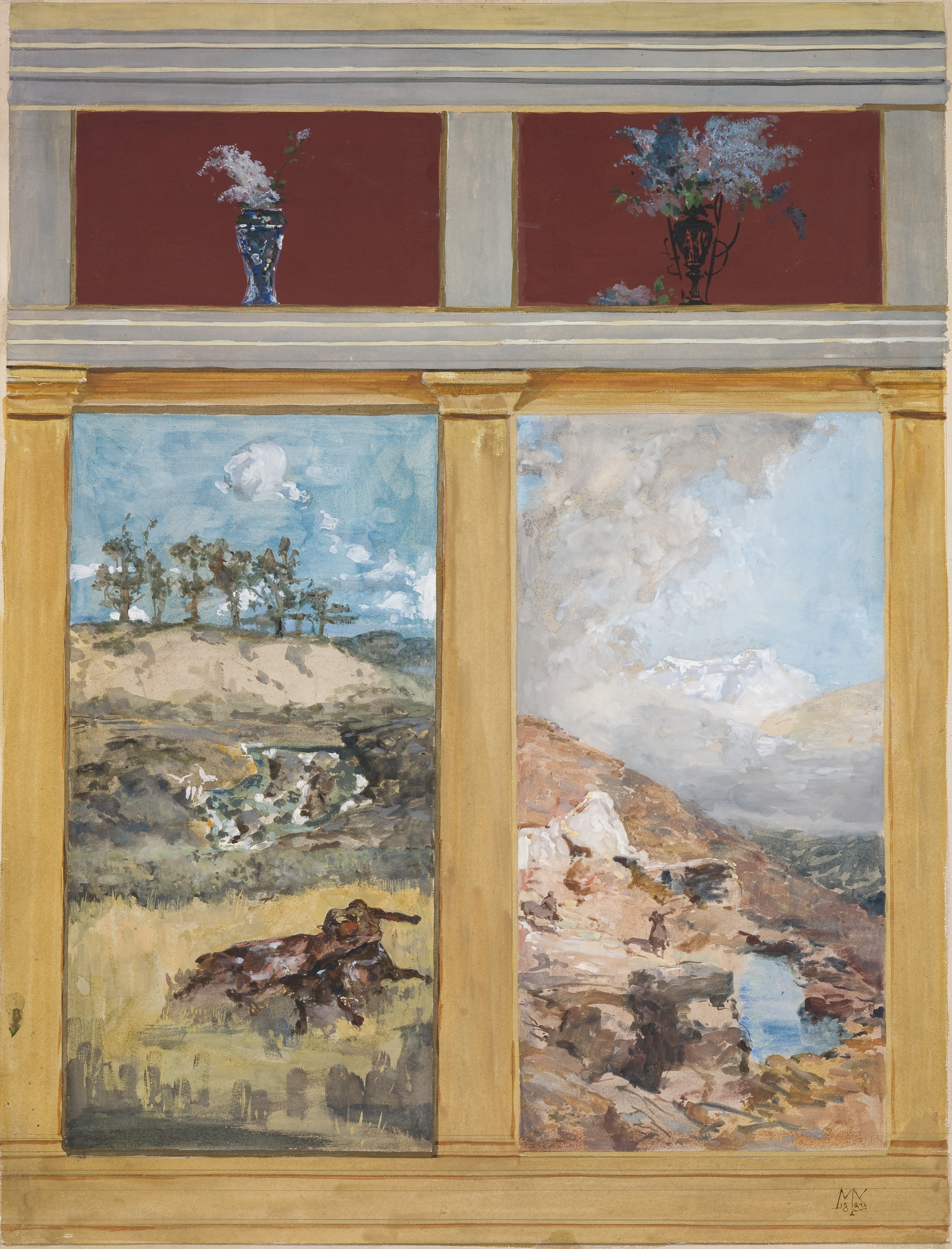 This study was part of a decorative commission for the vestibule of a villa belonging to the Austrian jurist Julius Albers. It was Klinger’s first such project, and he was given almost free rein in decorating the space with wall paintings and sculptures. He sought to create a Gesamtkunstwerk, a total work of art that unified architecture, painting, sculpture, and ornament into a cohesive whole. This model is all that remains of the mural, as the room was eventually dismantled and the paintings based on this study were destroyed in World War II (1939–1945).