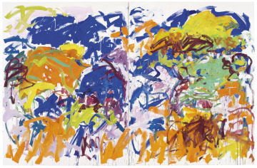 This impressive diptych—painting with two panels—is one of Mitchell’s final works and has a vibrancy that belies the artist’s declining health. Energetic sweeps of color, as well as paint drips and spatters, animate the picture surface. A second-generation Abstract Expressionist painter, Mitchell spent much of her life in France, settling in Vétheuil, a rural village outside of Paris, where she painted this composition. The picture’s title translates as “here.” Although it may seem abstract, there are references to nature everywhere, such as an orange sunflower bulb at left center and surrounding blues and greens that suggest sky and foliage.