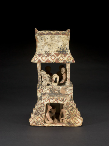 This miniature version of a house, with a below ground space and lounging dog, conveys many details about Nayarit architecture and domestic life. The activities of the various residents and geometric exterior decoration provide insight into their daily existence. Rather than an anecdotal representation of the everyday, this scene may have had a more symbolic function. The elites of West Mexico often placed their deceased ancestors in shaft tombs populated with ceramic sculptures of humans, animals, and food vessels. The lower level of this intricate house model may link the below ground burial and ancestors with the realm of the living above.