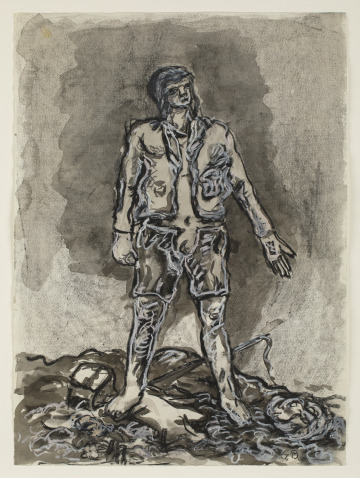 In his "Hero" series, Georg Baselitz depicted ragged, awkward men traveling through desolate landscapes. Baselitz, who emigrated from East to West Germany in 1957, employed the notion of the hero ironically to evoke both the propagandistic art of the Nazis and Socialist Realism, the official style of the Soviet bloc. Questioning the nature of heroism in the wake of the Holocaust, Baselitz offers his “hero” as a metaphor for the deep malaise—both physical and emotional—of Germany’s war-torn society.