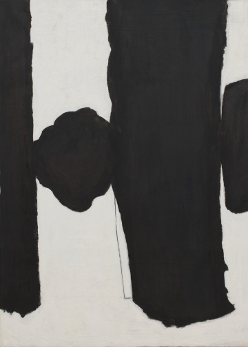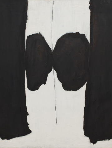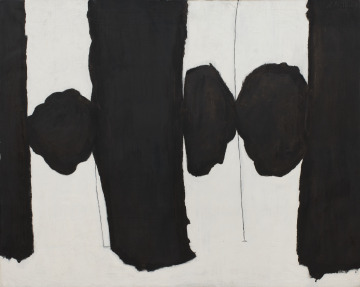 In 1948, Robert Motherwell began his monumental series Elegies to the Spanish Republic, which includes Catalonia, a title which references a region of eastern Spain. This painting consists of gestural black ovoid and rectangular forms on a white background. Outraged by the victory of General Francisco Franco’s fascist government in the Spanish Civil War (1936–1939) and the consequent demise of liberal values, Motherwell intended works like this one to have an explicitly political meaning: He wrote of them as “funeral pictures, laments, dirges, elegies—barbaric and austere.”