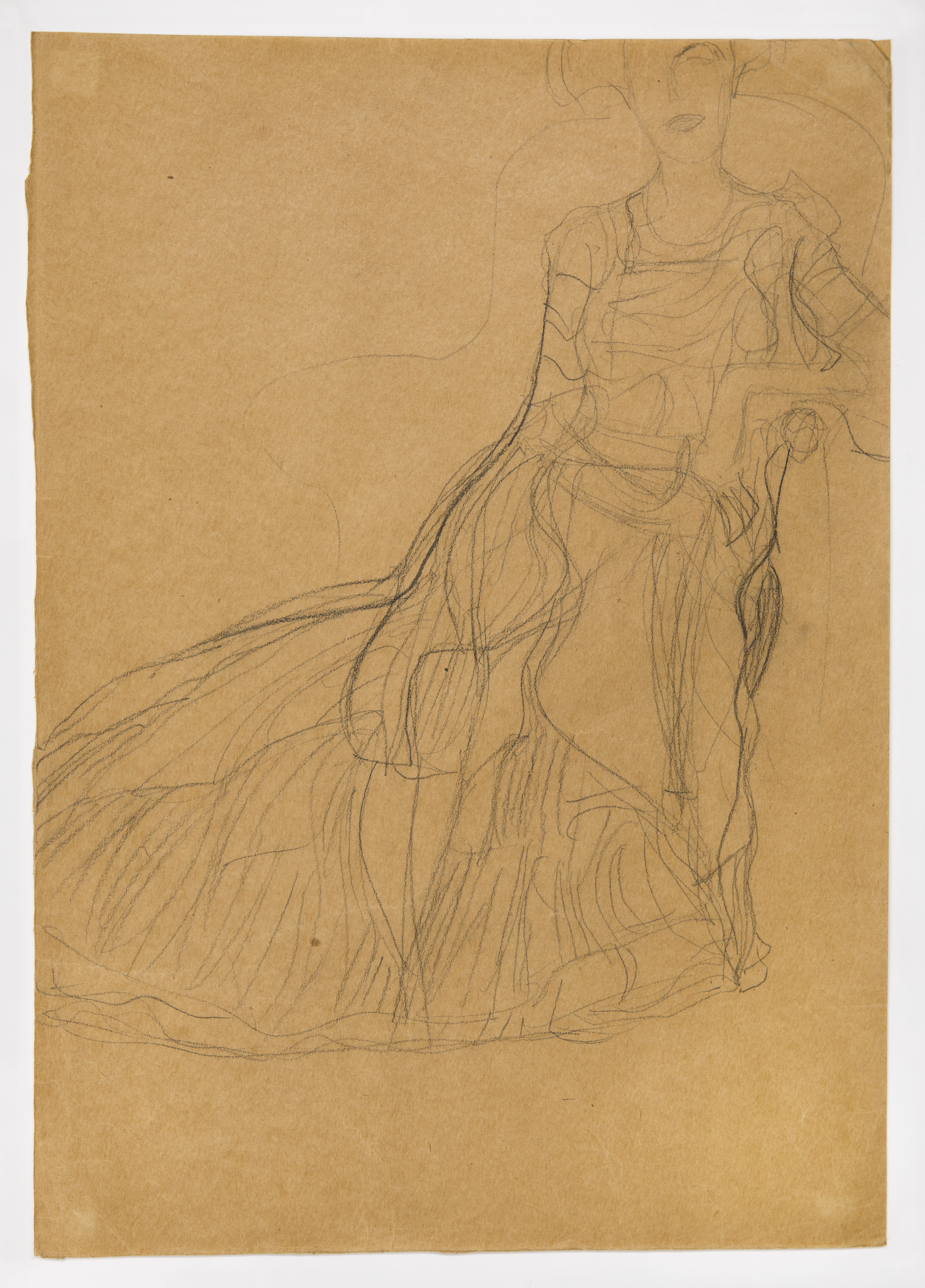 This drawing is one of hundreds of studies executed by Klimt for his 1907 painting of the Viennese art patron and philanthropist Adele Bloch-Bauer. While her position in this drawing is different from the final work, Klimt’s later style of decorative lines and geometric structure begins to become apparent in the study.