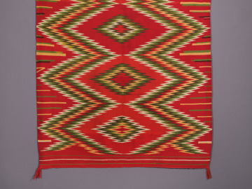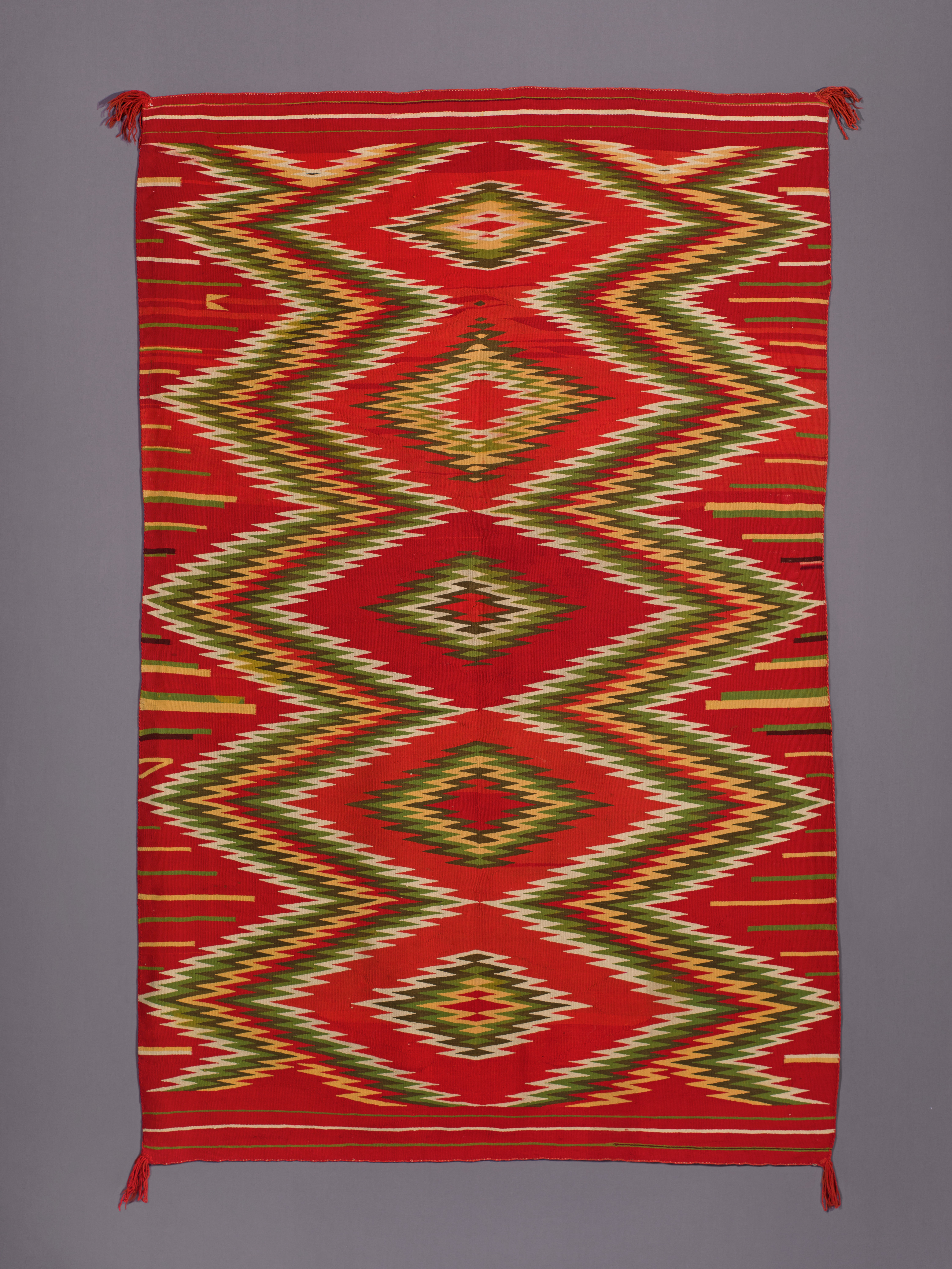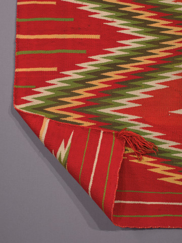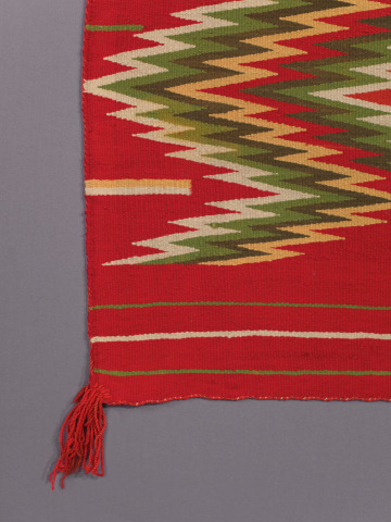 In the last decades of the 19th century, Diné weavers used new materials to create complex, vibrant textiles such as this work. Aniline-dyed yarns initially arrived when the federal government supplied these materials to the Navajo Nation as part of annuity payments following the Treaty of Bosque Redondo in 1868. Later, weavers obtained these yarns as well as synthetic, powdered dyestuffs from trading posts on the Navajo reservation.