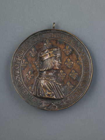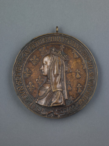 This medal was made to commemorate the entry of the recently married couple into Lyons on 10 July 1499. Louis wears the chain of the order of S. Michael. Anne is coiffed in typical headdress of Brittany. The lion beneath each bust represents Lyons. The inscription surrounding Anne reads, in translation, "Amid the joy of the commonwealth of Lyons, for the second time under the kindly reign of Anne that I was made. 1499."
