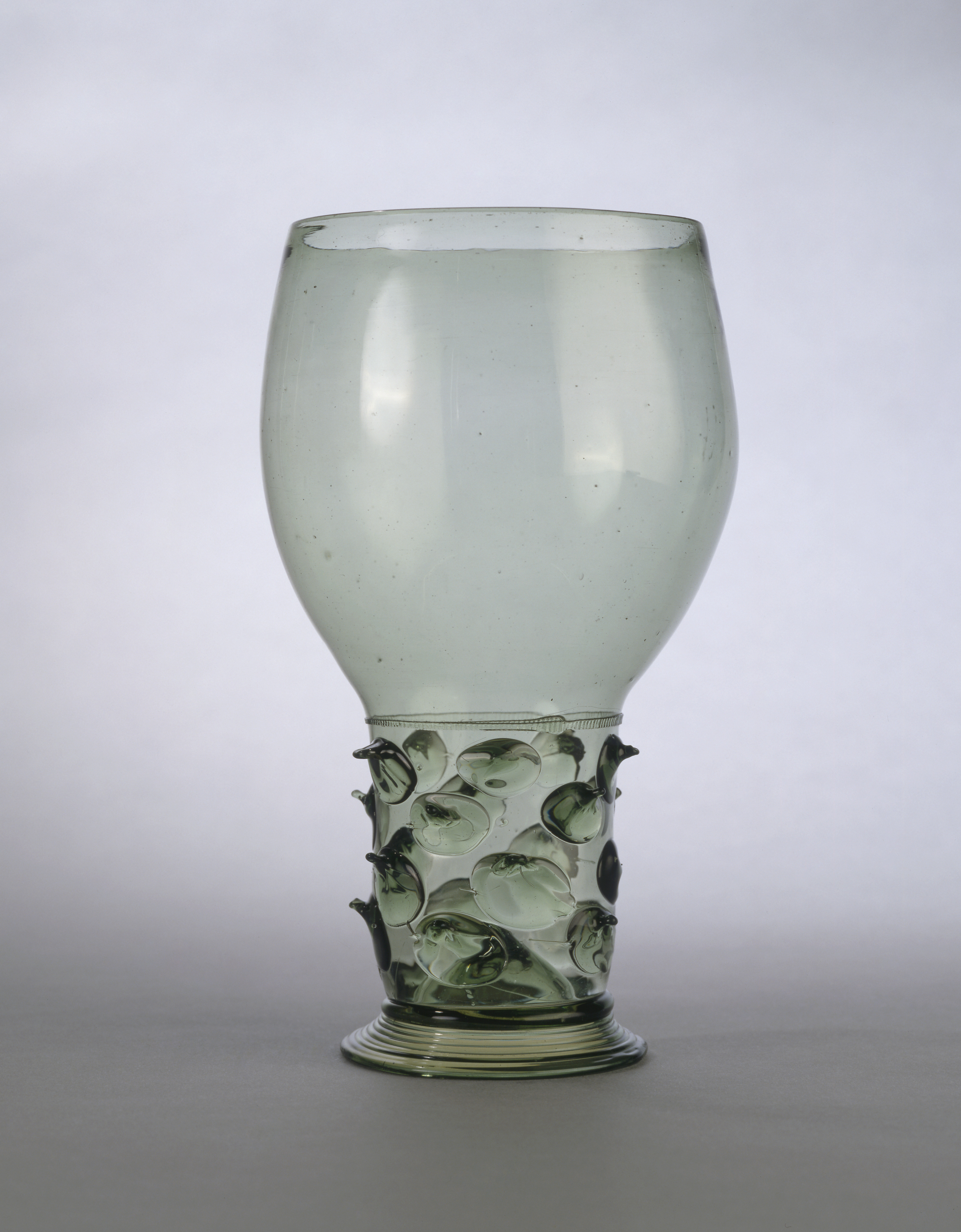 The simple shape of this wine glass, a blown bowl and stem resting on a flared foot, was a popular form often included in 17th-century still-life paintings. The wide stem is typically decorated with bits of glass applied to the surface; sometimes these bits were stamped into shapes resembling raspberries.
