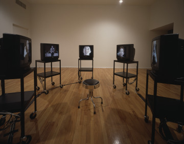 World Peace (Received), an installation piece made over thirty years into Bruce Nauman's career, considers the possibilities and limits of communication. Five video monitors are placed around a stool, inviting visitors to the gallery to sit, to listen, and to watch the monitors, each of which features a different speaker. The people seen on the monitors (an actress, a playwright, a painter, a ranch hand, a poet, a professional translator for the deaf, and a deaf actress) speak or sign variations of the following script: "I'll talk, you'll listen," "You'll talk to them, they'll listen to you." The declarative mode of the piece may prompt viewers to ask their own questions: How do we sound to others? Who is speaking? Who is listening? Often dismissed in our culture as an instrument of shallow comfort, television is used in this work as a vehicle of abrasive and challenging speech.