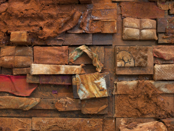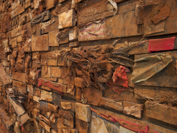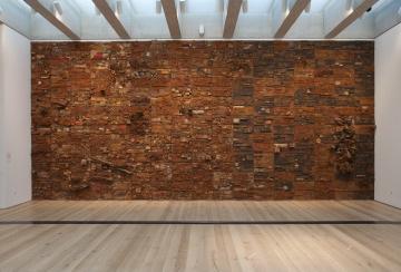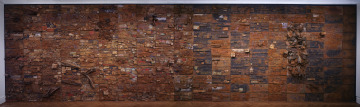 In this wall-mounted sculpture, Leonardo Drew arranged over 300 wooden panels covered with fabric, string, feathers, and other discarded objects, which he then burned, rusted, and stained. According to Drew, his art is rooted in his experiences of living and growing up in New York City, where daily life involves navigating the city’s gridded streets and organic decay. He also cites other inspirations such as the history of African Americans in the United States and a trip to Senegal where he visited a former slave trading post. Despite such specific sources, Drew likes to keep his work open to interpretation: “I think that these pieces should become mirrors. They should be a collection of ideas and never a one-sided issue.”