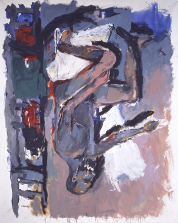 At first glance, this painting by Georg Baselitz may appear to be an abstract composition of expressive brushstrokes. Upon closer inspection, the representational subject matter of the work becomes apparent. Baselitz presents a seated self-portrait shown upside-down; the artist’s bald, bearded head appears near the bottom of the canvas. In many of his paintings, the artist inverted his subject matter in order to prevent the viewer from registering only the representational content in his work. This tactic slows down the viewer’s act of looking and draws attention to the physical handling of paint.