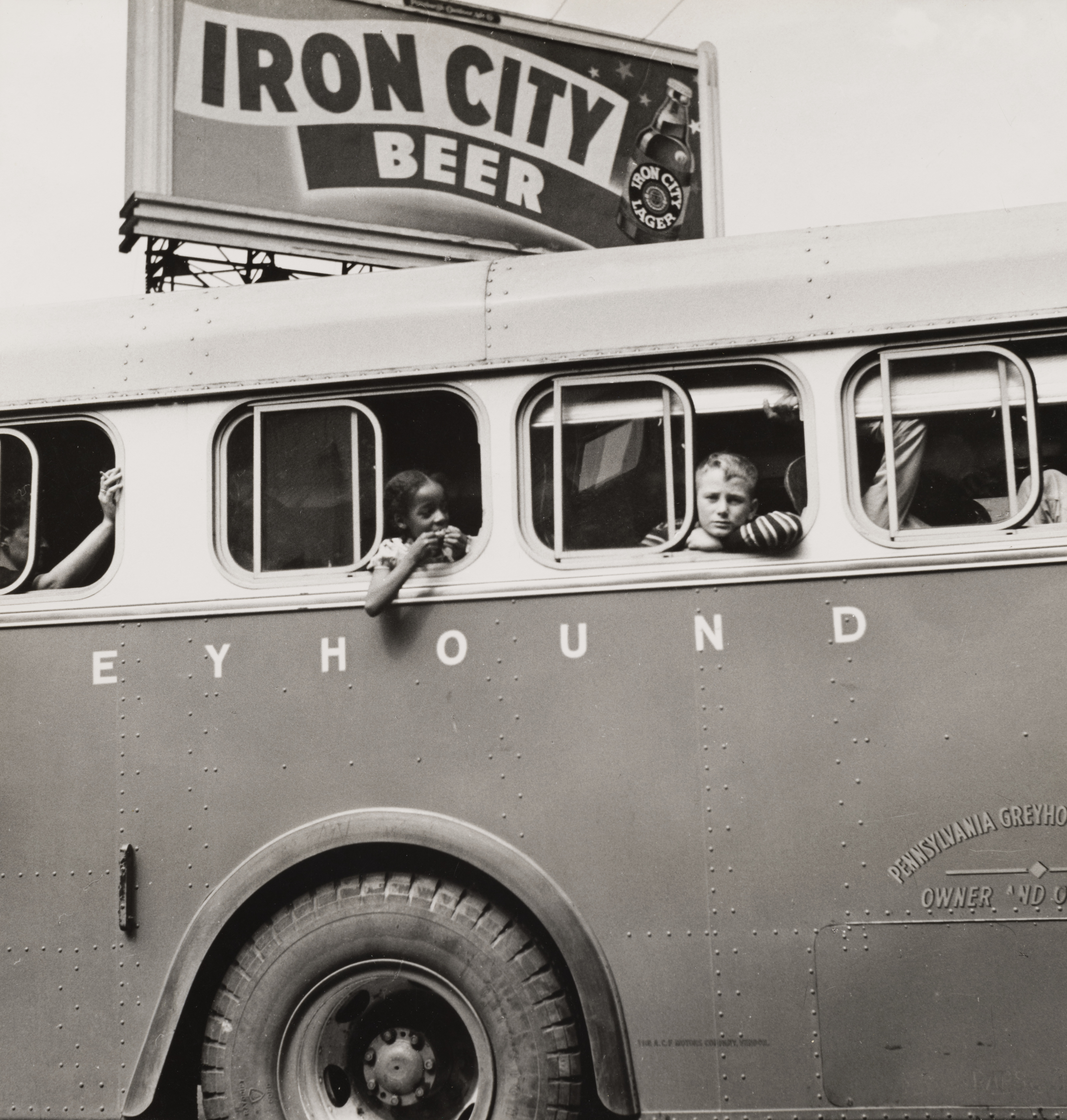 A Black girl and a white boy peer out the windows of a Greyhound bus at a station in Pittsburgh. Esther Bubley, a photographer for the FSA and its successor, the Office of War Information, took road trips via the Greyhound bus system to produce her work, contrasting with more-automobile-reliant FSA photographers. Bubley was only 22 years old when she set off from Washington, DC, on her first bus trip. The Iron City Beer advertised on the billboard above the bus remains a Pittsburgh mainstay.