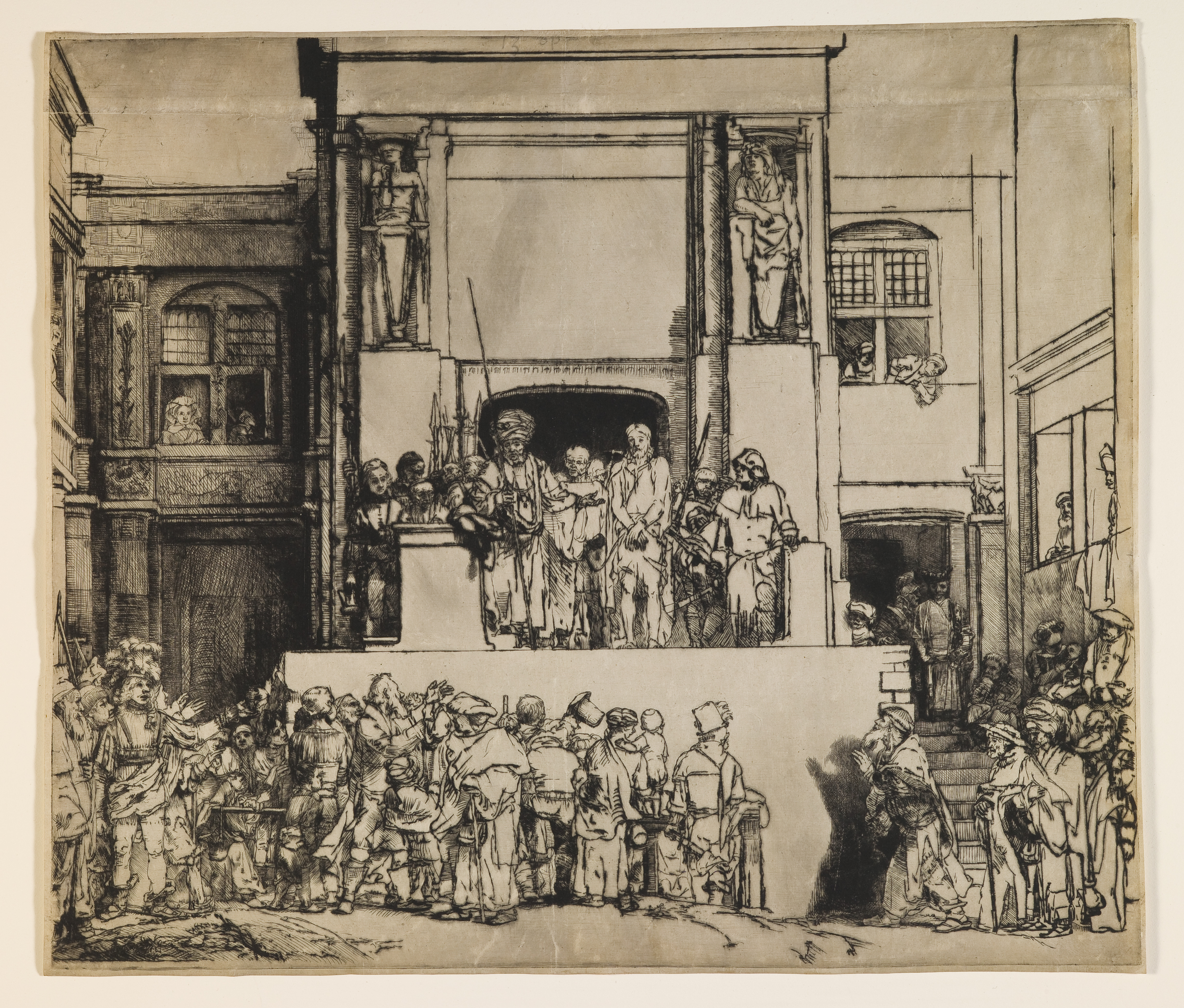 Silhouetted by a dark arch, the three protagonists from the Biblical New Testament, Pontius Pilate, Christ, and Barabbas, stand on the podium before a large civic building. Pilate, wearing a turban, has already asked the crowd before him: "Which of the two do you want me to release to you?" They shout, "Barabbas!" Rembrandt captures the moment when Pilate, pointing towards Christ, asks them the next question: "What then shall I do with Jesus who is called Christ?" They all shout back, "Let Him be crucified!" Surrounded by an extraordinary architectural setting, soldiers, and the surge of the crowd below him, Christ looks helpless and isolated.