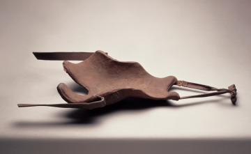 Resting inside one of Joseph Beuys’s characteristic glass display cases, this sculpture is an iron cast of an old-fashioned back support, originally made from leather or plaster. The purpose of this object—to hold a person whose back is injured or to support someone whose backbones are too weak—becomes a metaphor for Beuys’s artistic project. The sculpture addresses individual and universal suffering, as well as the role of art as a means of healing and spiritual strengthening.