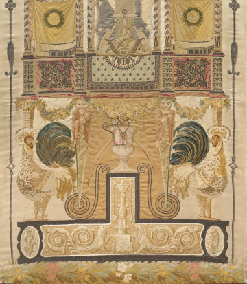 France became the silk and fashion center of the world during the reign of Louis XIV and under the direction of his Minister of Finance, Jean-Baptiste Colbert. While the identity of most designers of luxurious silks made at the end of the eighteenth and beginning of the nineteenth centuries are unknown to us, the name of Jean-Démosthène Dugourc was well known as he was considered the leading interior decorator of his time. Dugourc had an interest in antiquity that meshed well with the Empire style promoted by Napoleon and helped bridge the stylistic evolution from the rococo to neoclassical periods.