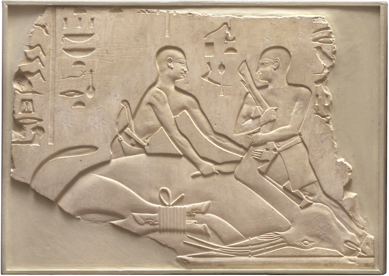 Mentuemhat was Prince or “mayor” of Thebes, a prophet of the god Amun, and governor of Upper Egypt. A hugely important political figure, he lived through the Assyrian invasion, their sack of his city, and the return to power of a new Egyptian dynasty. The reliefs that decorated his enormous tomb imitate many different artistic styles and suggest that Mentuemhat had more than a passing interest in art. These butchering scenes emulate an Old Kingdom style that had been popular when Egypt was powerful and building her eternal pyramids.
