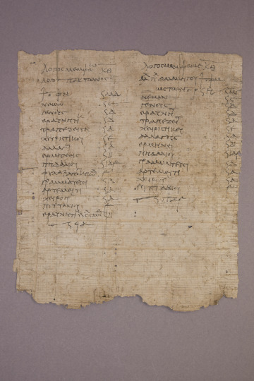 This nearly 2,000-year-old papyrus fragment records the expenses associated with transporting two shipments of wheat to the city of Memphis via the Nile River. Included in the list are the fees paid for commissions, taxes, repairs, an interpreter, and guards. The fragment comes from the site of Oxyrhynchus in central Egypt, where, during the late 19th and early 20th century, thousands of documents dating from the 1st–6th centuries CE were discovered.
