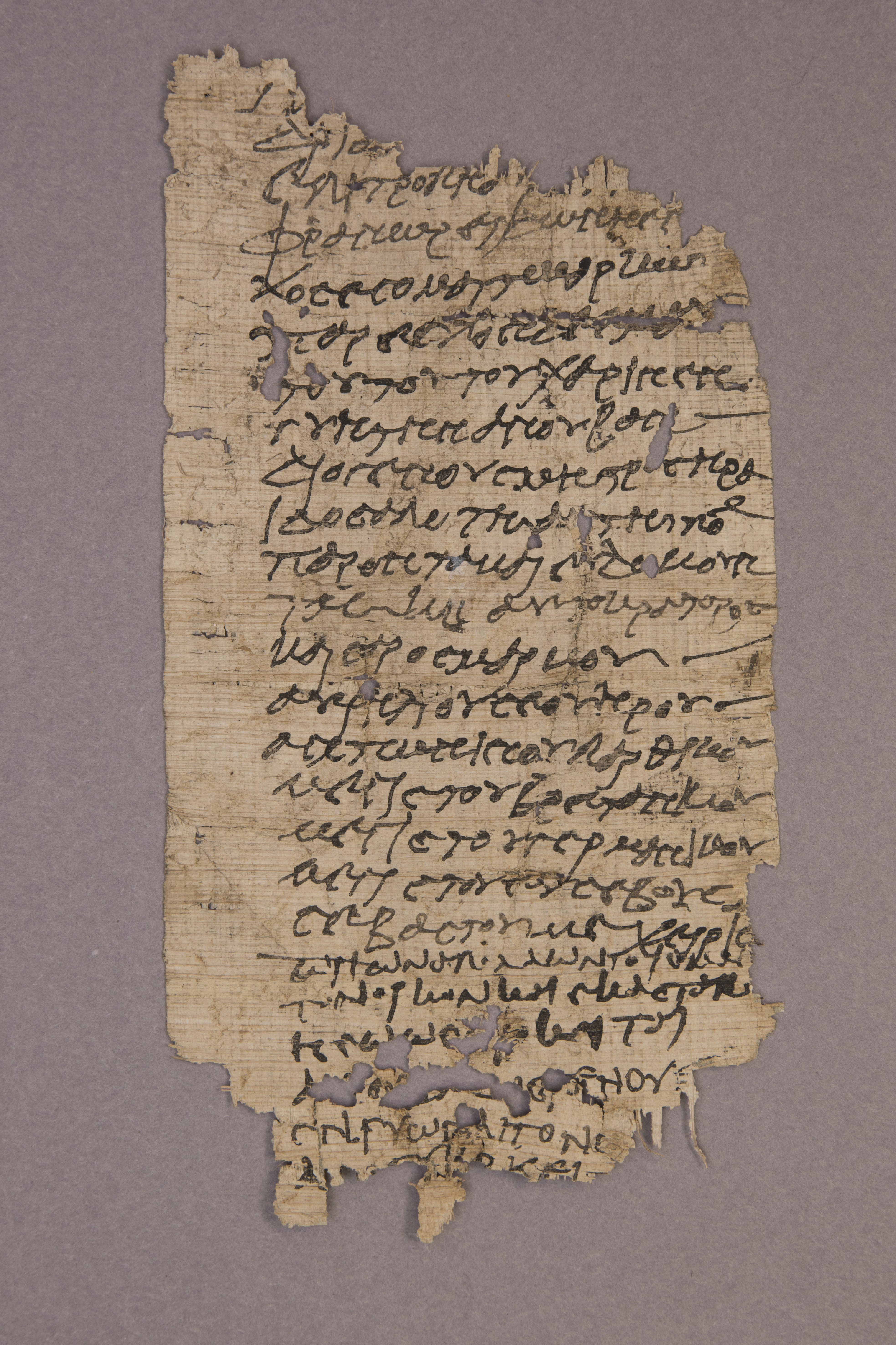 This papyrus fragment comes from the site of Oxyrhynchus in central Egypt, where, during the late 19th and early 20th century, thousands of documents dating from the 1st–6th centuries CE were discovered. This fragment records the conclusion of a declaration concerning a voyage to the ancient port city of Alexandria and a pledge in connection to some kind of official position. It is difficult to fully decipher the text since only a portion of the 26 lines of text is preserved.