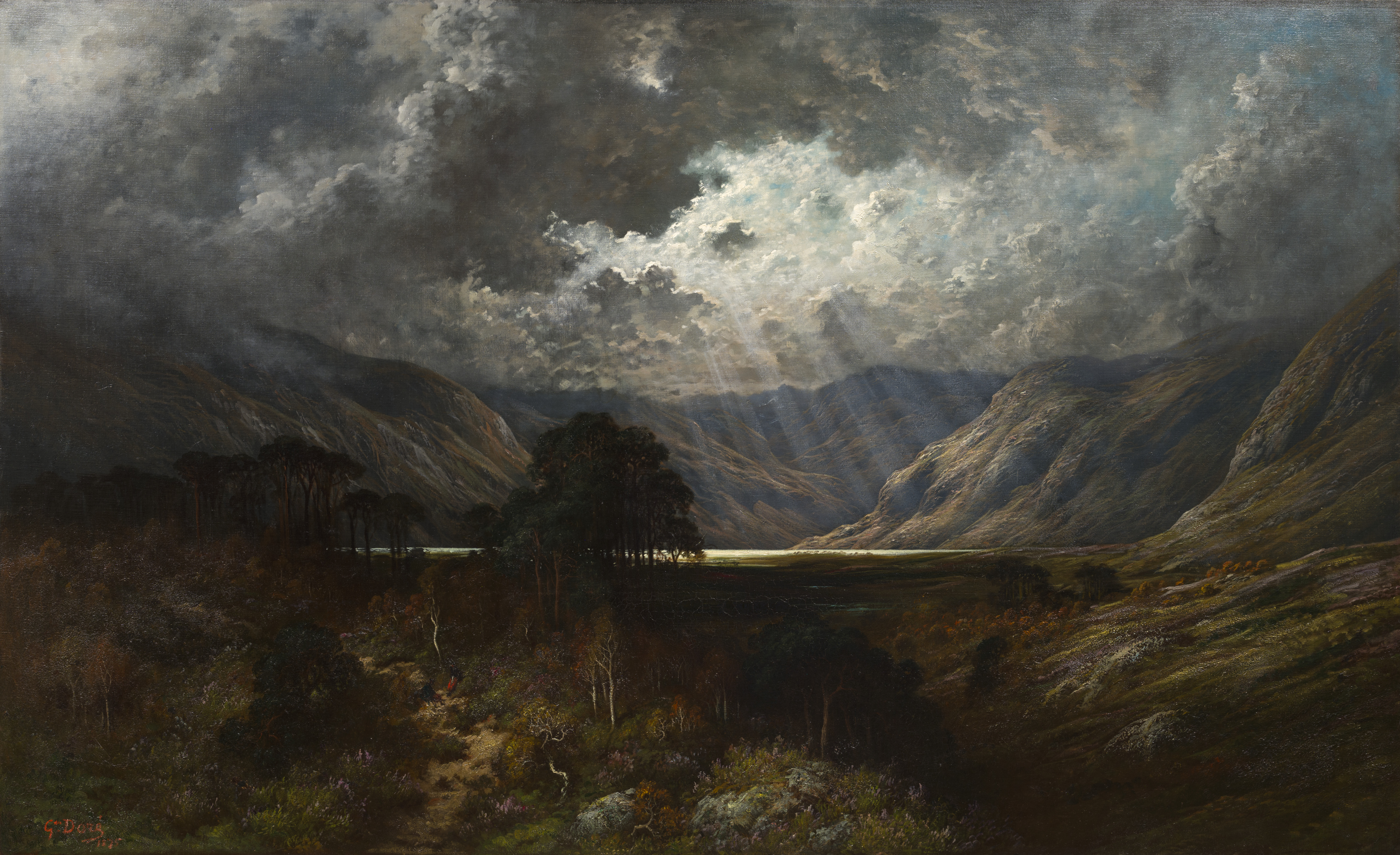 In 1873 the prolific illustrator Gustave Doré went salmon fishing in Scotland; the trip provided him with inspiration for a series of grand landscapes. This dramatic work is animated by rays of light bursting through the clouds and falling on the distant lake. A tiny figure in red, on the path at bottom left, provides a color accent contrasting with the dominant greens of the composition. Doré evoked a vision of the Scottish landscape as sublime and awe-inspiring.