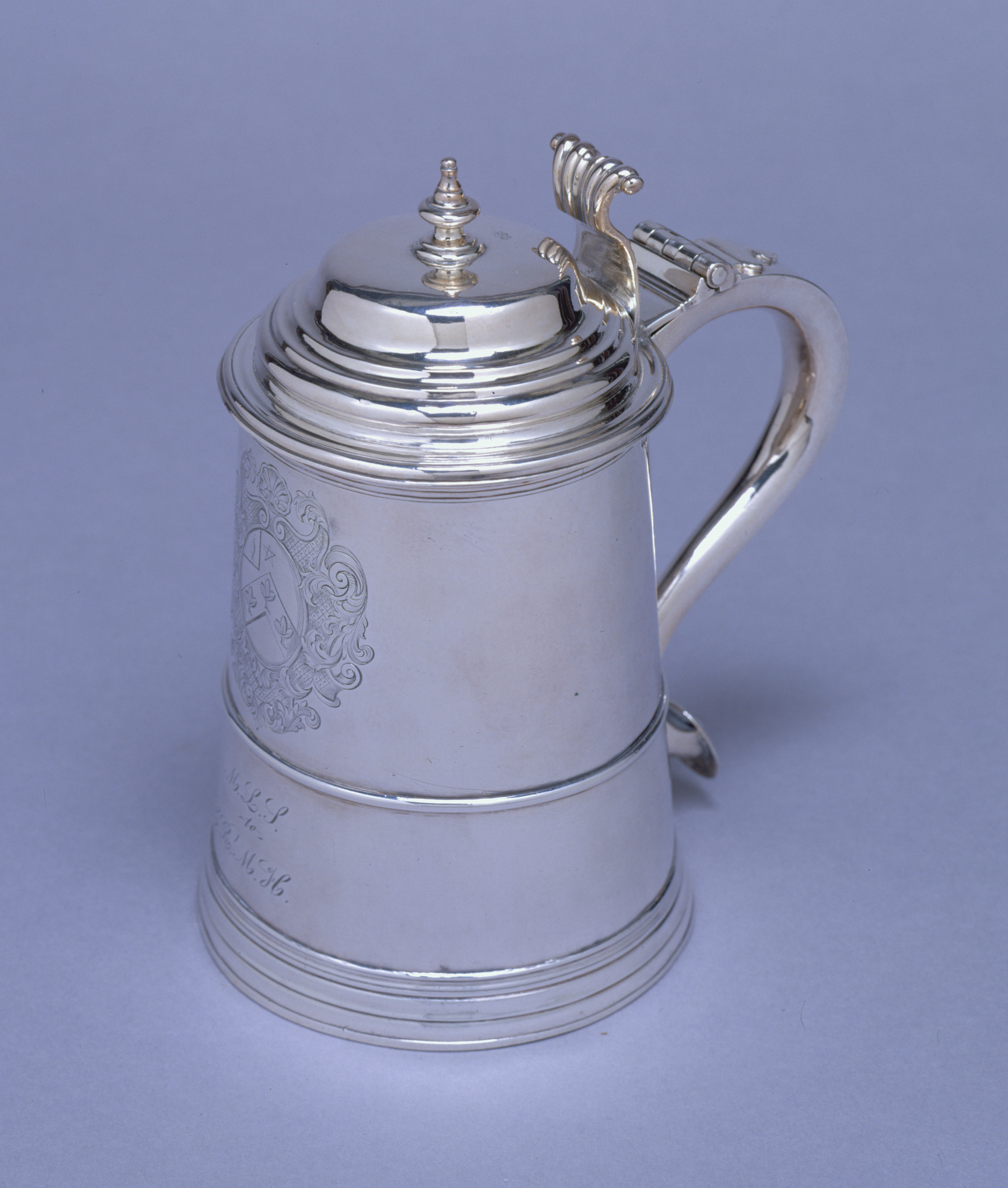 Another important element in the tankard's design is the engraved cartouche that encloses the owner's coat of arms. Composed of rich, three-dimensional foliage, scrolls, and shells on an imbricated ground, the cartouche demonstrates the flourishing of ornamental engraving in the baroque style in the early eighteenth century.