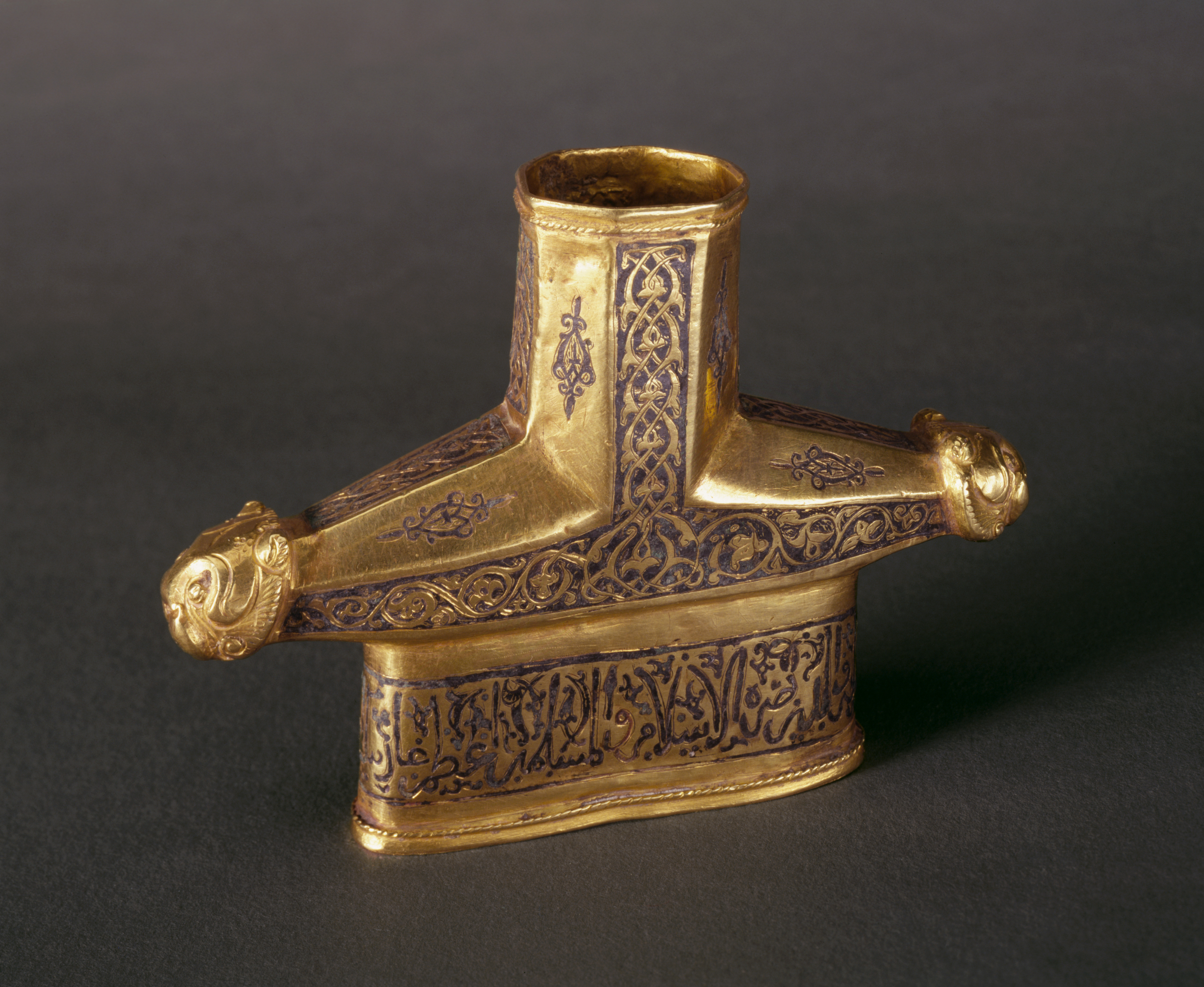 This sword hilt includes an elegant Arabic inscription that encircles its base. The inscription has been translated by the scholar Will Kwiatkowski as “The glorified lord, the greatest Khaqan, prince of the horizons, Shams al-Dawla wa’l-Din, aid of Islam and Muslims, greatest Ghazi Beg Aydughmish." These words are inlaid with niello, a black metallic mixture used on engraved metal to provide a visual contrast with the polished gold or silver.