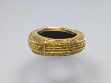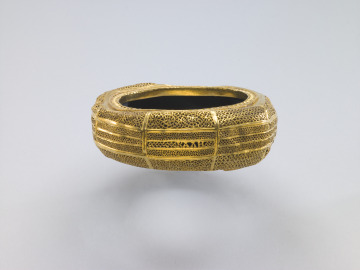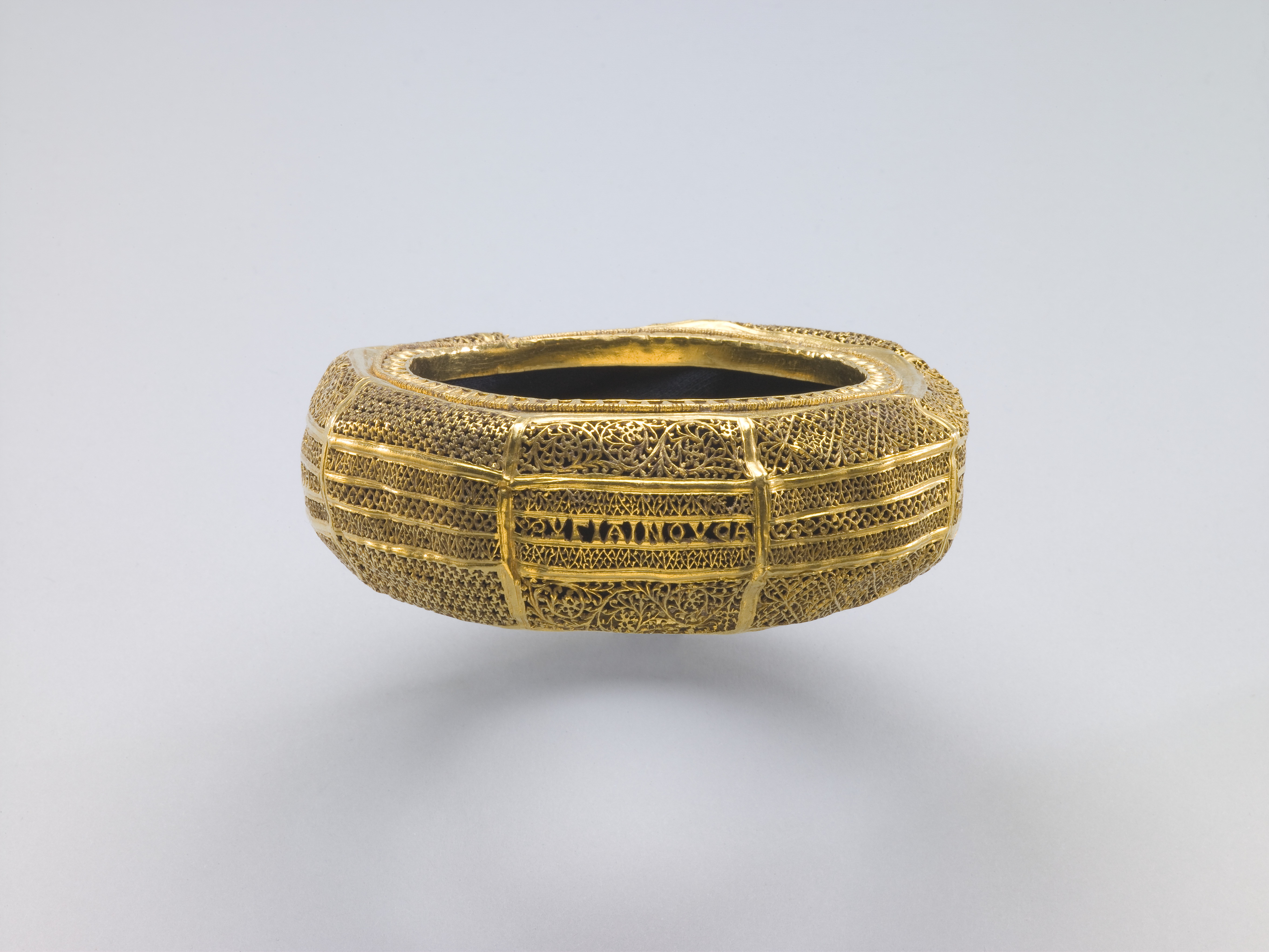 Originally part of a set (with a matching bracelet and bell, now in Berlin), this bracelet likely functioned as a betrothal or bridal gift to a woman of high social standing. The central section contains a Greek inscription that reads: “Pretty one, wear [it] in good health.” This intricate bracelet serves as a splendid example of the extraordinary craftsmanship of Byzantine artisans and their use of an open metalwork technique known as opus interrasile.