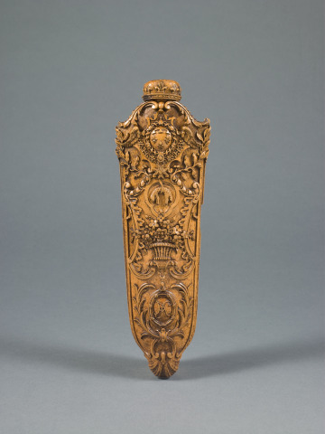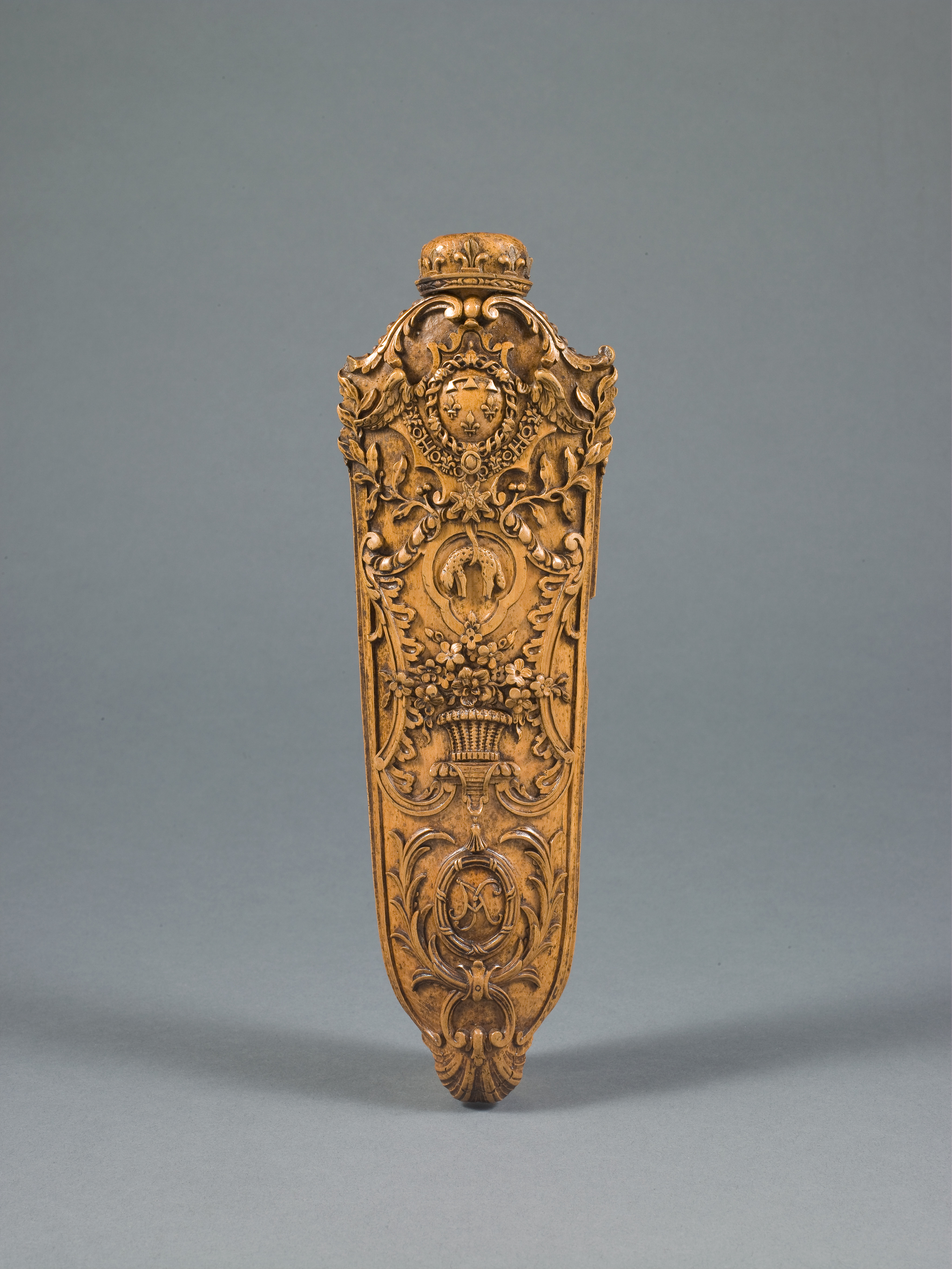 The coat of arms that adorns the upper part of this snuff rasper (grater) demonstrates an aspect of the heraldic arts called "cadency." The first-born son was entitled to use the arms of the father, but added a bar with three horizontal appendaged signifying his position as heir. The bar appears at the top of the shield, above the three fleurs de lis, long associated with the French royal house.