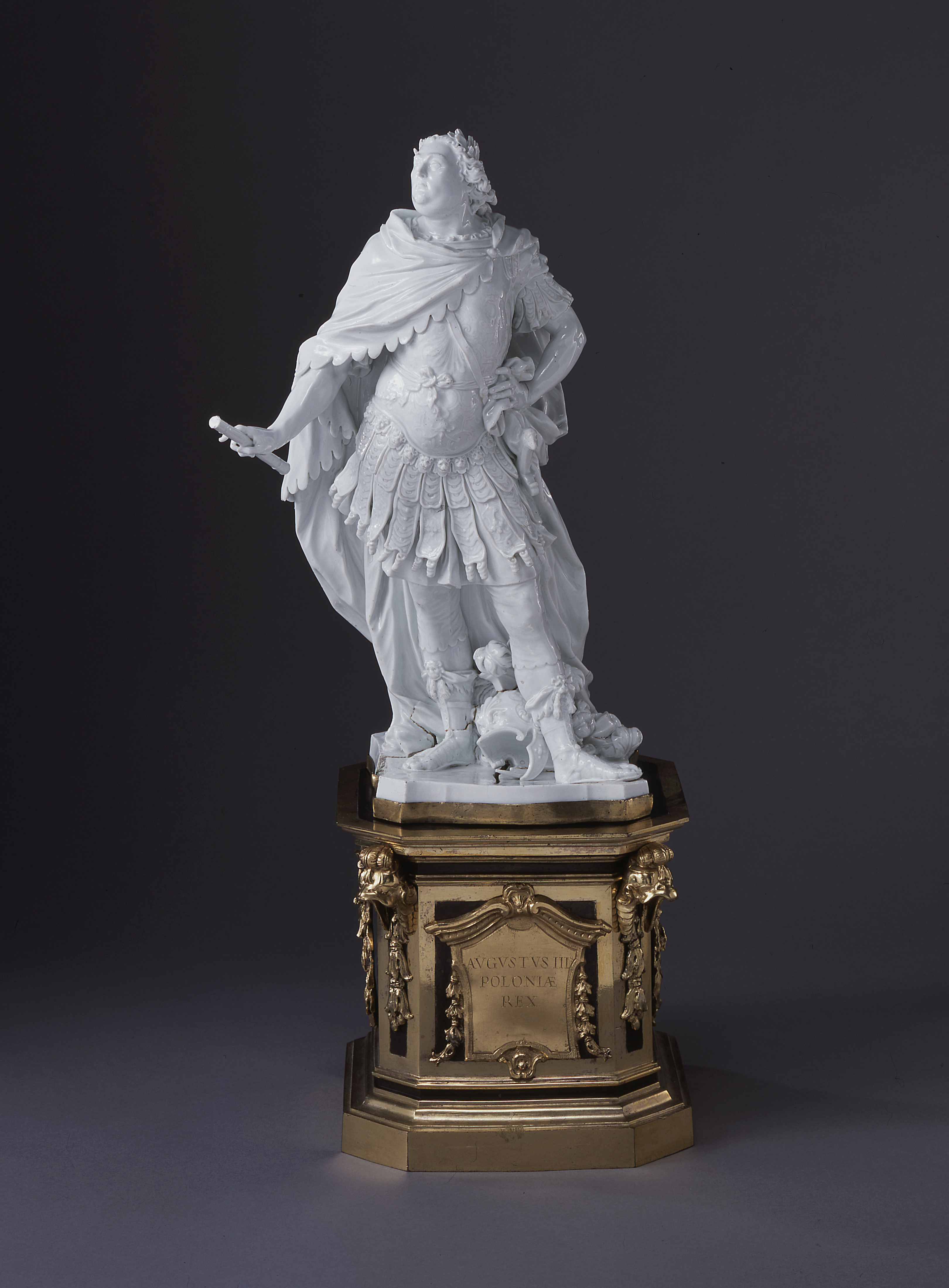 This portrait of Augustus was modeled from life. The king's pose, gesture, and Roman-style armor are formulas of state portraiture, intended to affirm the king's power and virtue by clothing him as a classical hero. Far from formulaic, however, is the richly modeled and chased breastplate, which reveals the king's substantial torso, the scale-ornamented plates of his skirt, and the plumed helmet at his feet. The figure is a masterpiece of ceramic sculpture, both for its artistic virtuosity and for the technical challenge of firing so large a piece of porcelain.