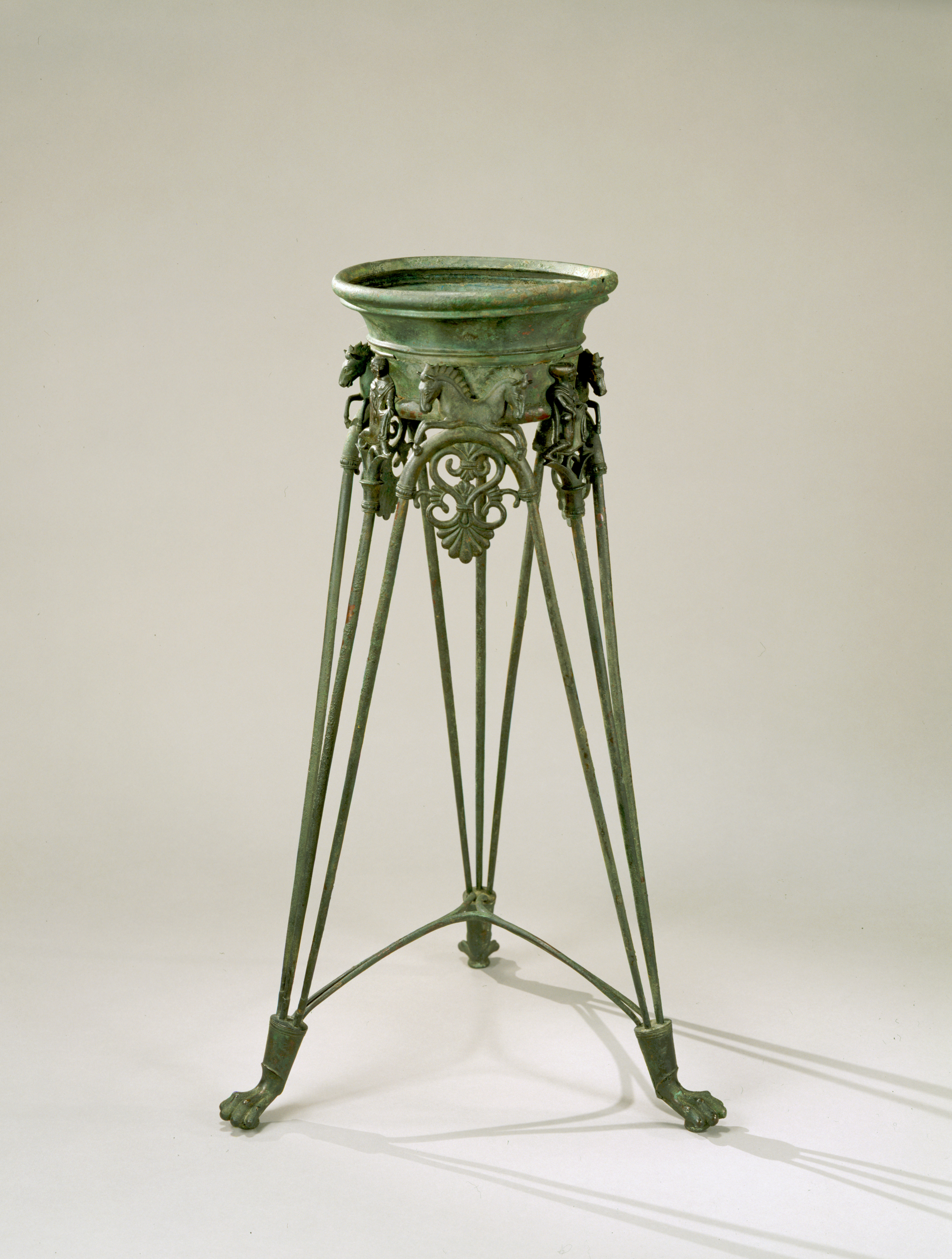This magnificent bronze stand, called a tripod from Greek "tri" (three) and "pous, podos" (foot) would have been used as a support for a cauldron of wine served at an elaborate ritual dinner party. Cast in several pieces, this tripod is likely from the city of Vulci, in the central region of Italy called Etruria, where other similar stands have been excavated. The top of each animal leg is decorated with elaborate palmettes and double horse heads. Between these decorations are three figures: two women and a man each placed on a lotus flower.