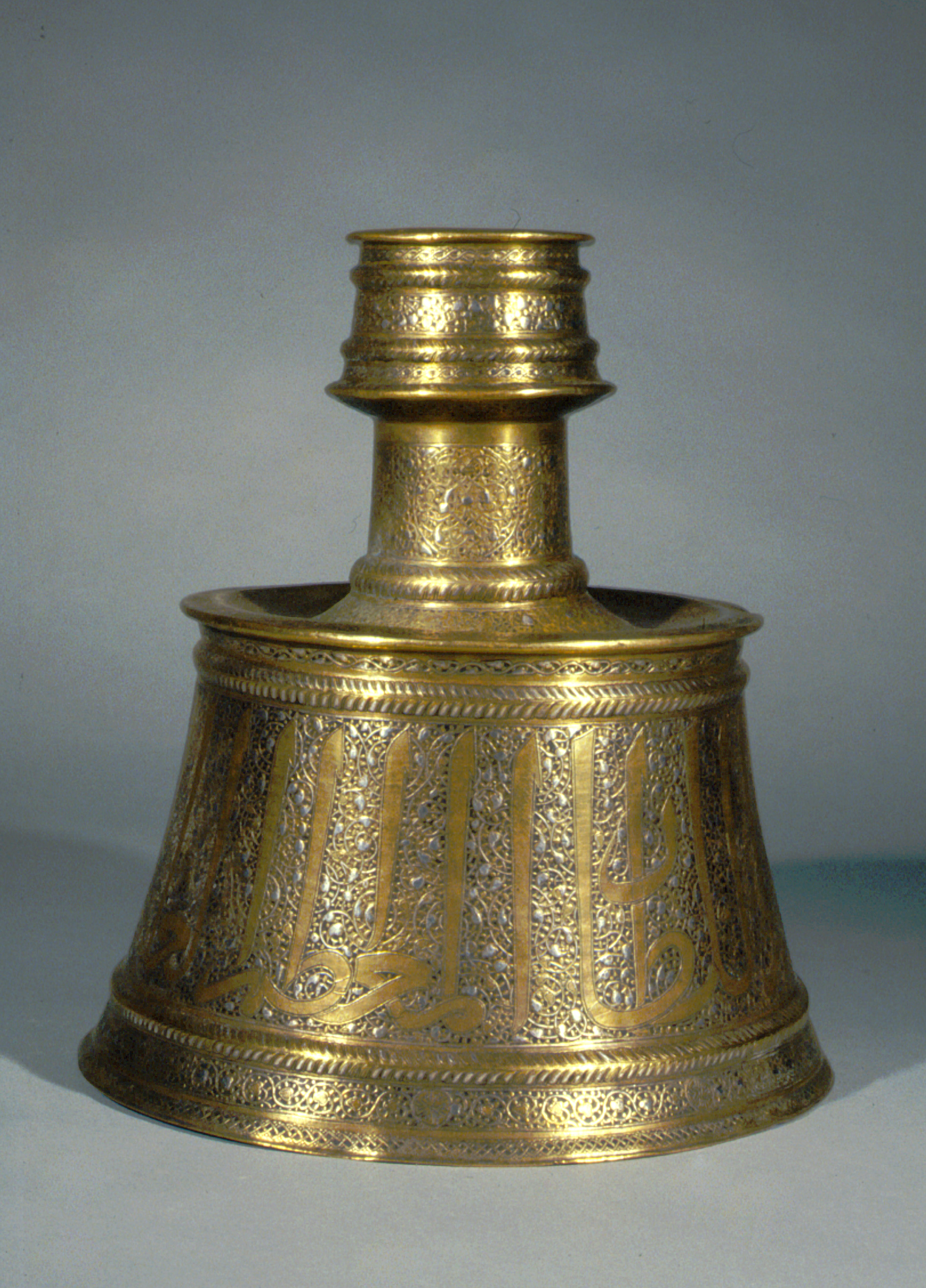 The Arabic inscription on this candlestick says, “Glory to our Lord, the lofty King, the Sultan, the magnificent, the wise, the just.” Such inscriptions that do not name a specific individual indicate that the piece was made for sale in the market rather than by the order of a particular patron.