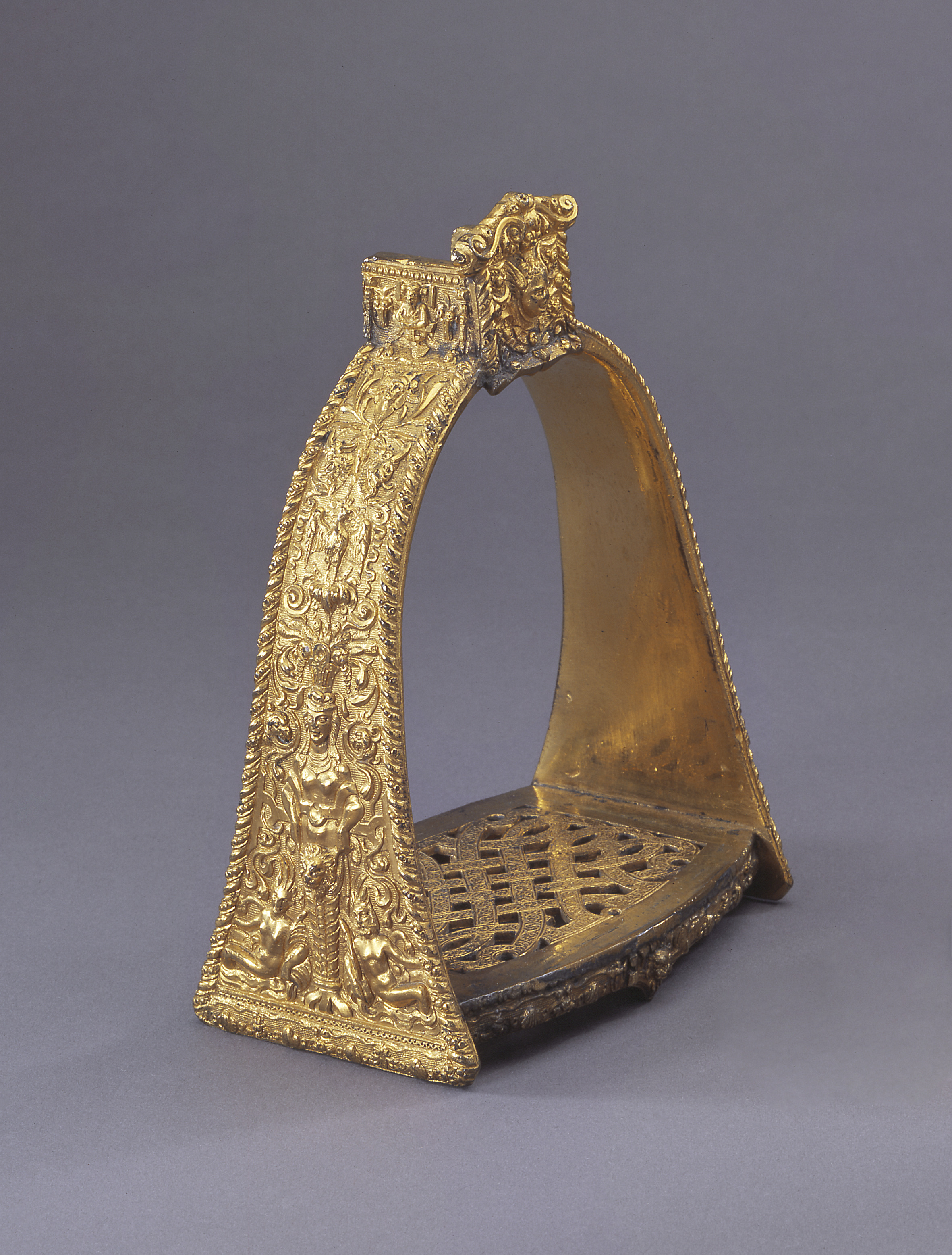 This pair of stirrups, used as footrests by riders on horseback, was one of four nearly identical sets made for Emperor Ferdinand I of Austria (1503-1564) and his three sons. Cast in the same mold, the stirrups were crafted of bronze with heavy gilding. The densely ornamented surface includes deities and animal figures amongst fruit and scrolls producing a jewel-like effect. The imagery derives from the rich legacy of ancient Rome.