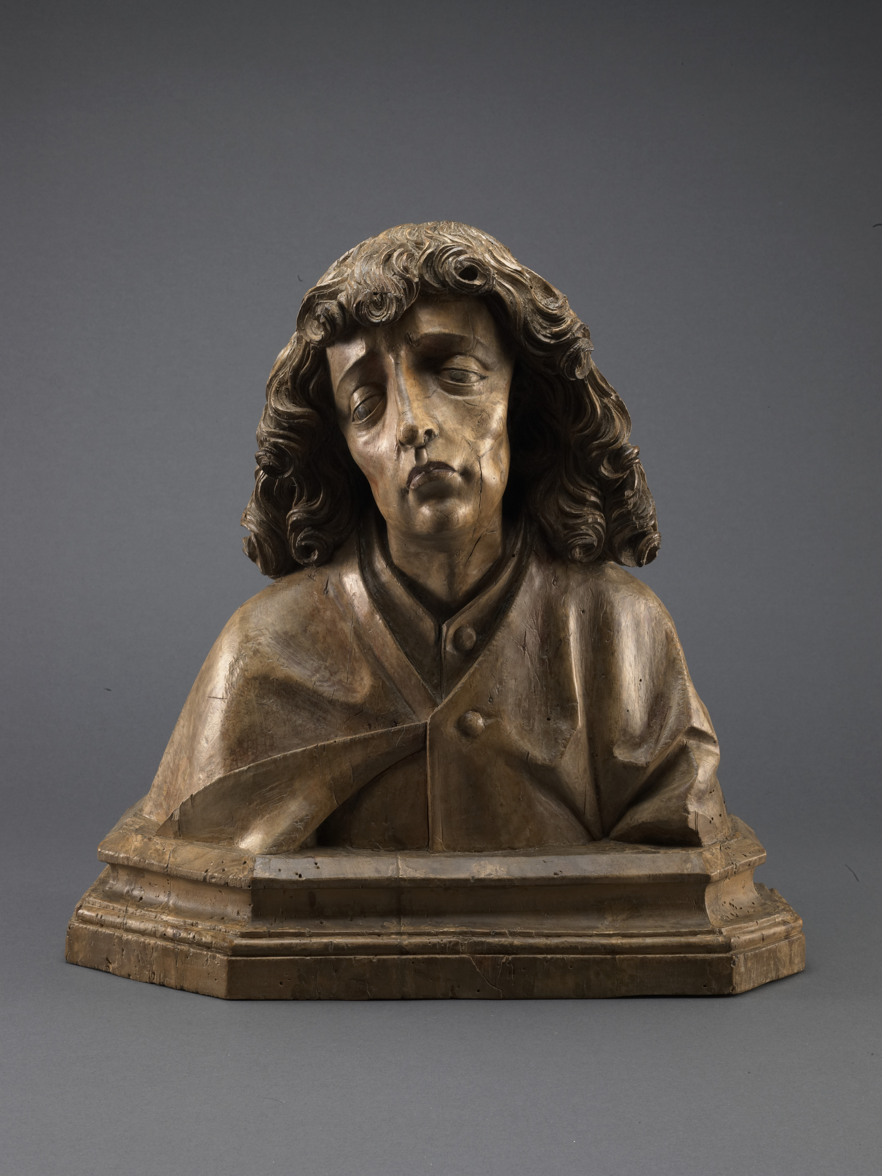 The downward curve of John’s mouth and the echoing arc of his eyes and brow let us know that the saint is in distress. Artists typically depicted John as the youngest and most emotive of Christ’s followers. This sculpture, originally a standing figure at the