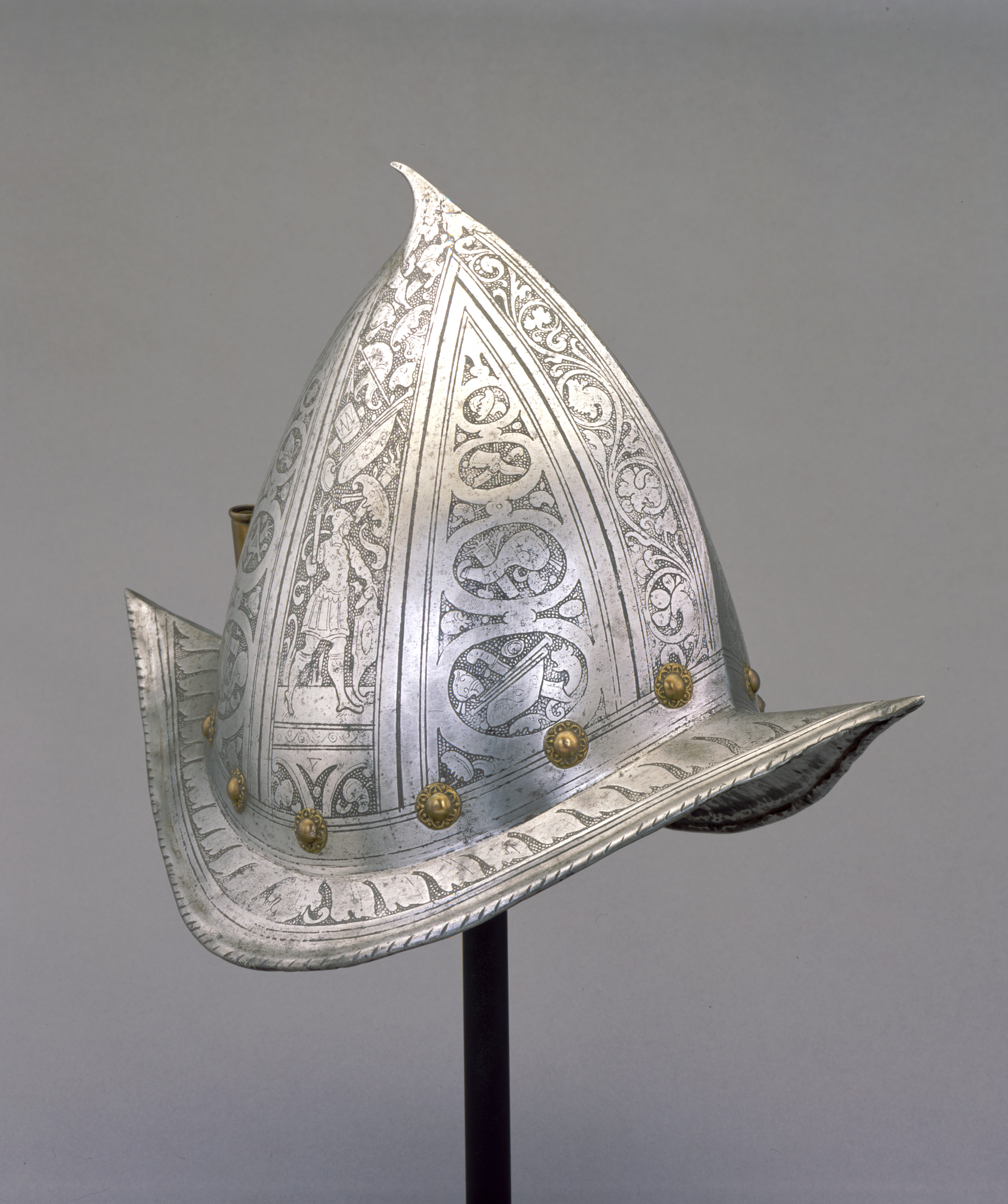 This type of helmet combined the flat curved brim of the morion helmet which had a crest on top from front to back and the almond-shaped skull of the cabasset helmet. This combination produced a light and elegantly formed head defense. Such open-faced defenses were popular on the battlefield with soldiers on horseback and on foot, as they provided good protection without interfering with the visibility necessary to aim hand firearms. The surface of a morion-cabasset lent itself to decoration, and finely etched ones like this were popular helmets for the bodyguards of powerful nobility.