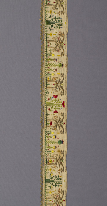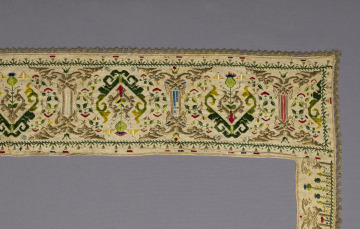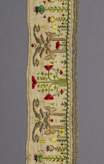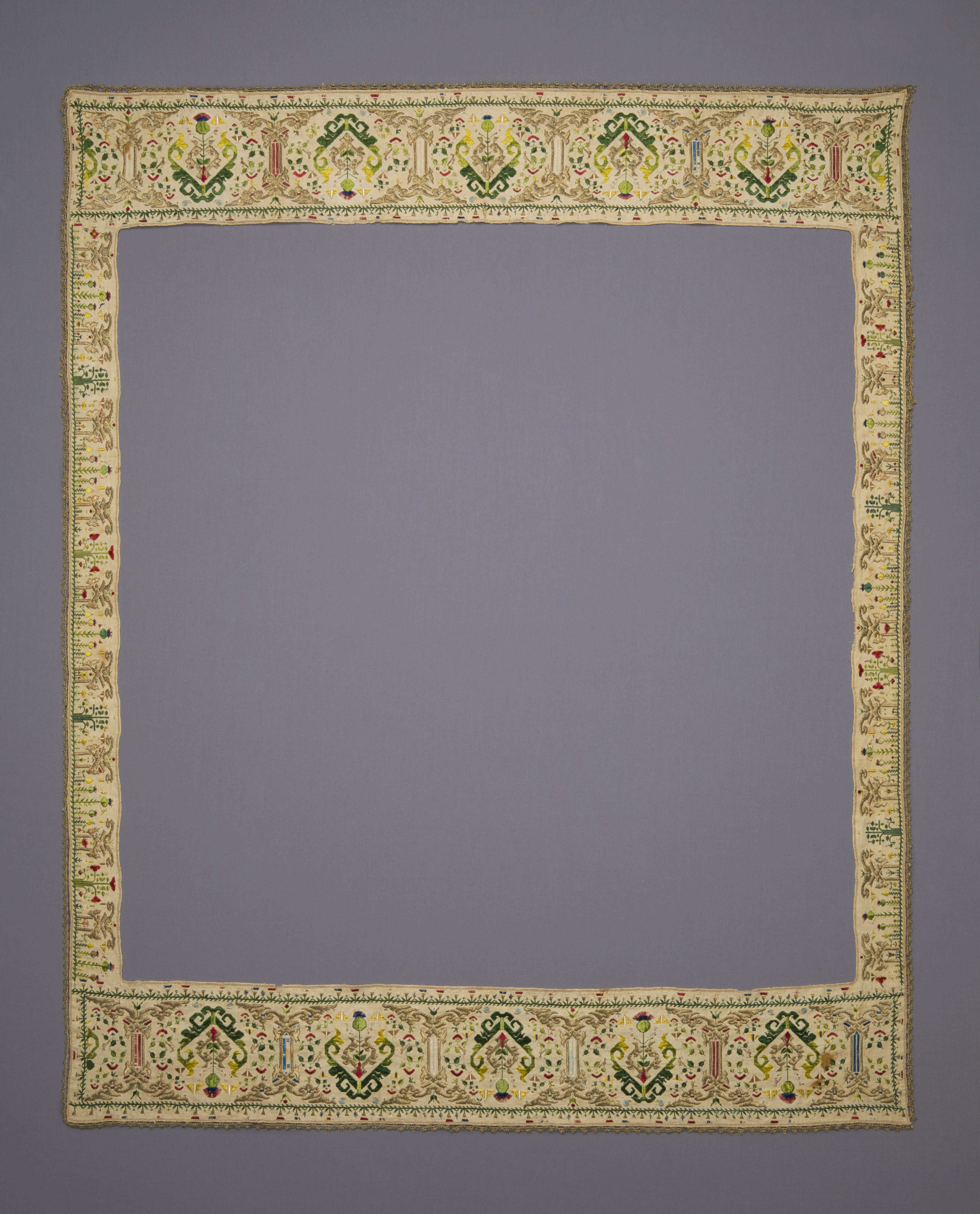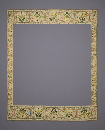 Tiny birds, butterflies, and snails flit and slink among the repeated columns and blossom motifs of this embroidered table cover. In the early 16th century, materials like silk floss threads became more readily available, and printers began producing pattern books with designs for embroidery. By the time this cover was made, silk embroidery was widely practiced by women across social classes. It can be difficult to attribute band designs to specific cultures as they appeared with only little variation on domestic textiles and garments across Europe, including areas of the Balkans.