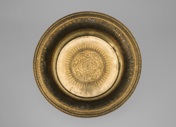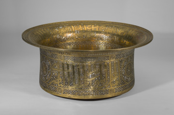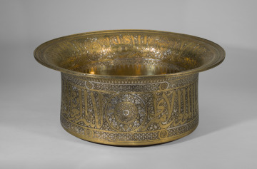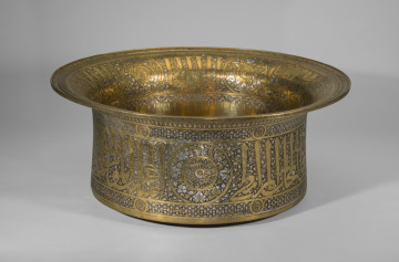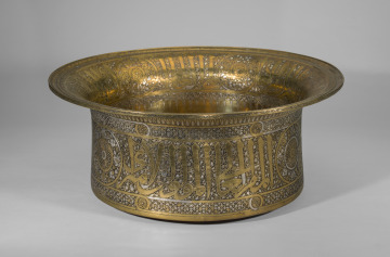 The stately Arabic inscriptions encircling the exterior of the basin and its interior rim indicate it was created for a high-ranking officer of the Mamluk ruler al-Malik al-Nasir (ruled 1293–1341). The Mamluks ruled Egypt and Syria from 1250 to 1517. In 1322 they signed a peace treaty with the Mongols, opening the way to trade with China. Contact with China introduced new motifs, such as the lotus flowers in the roundels on this basin.