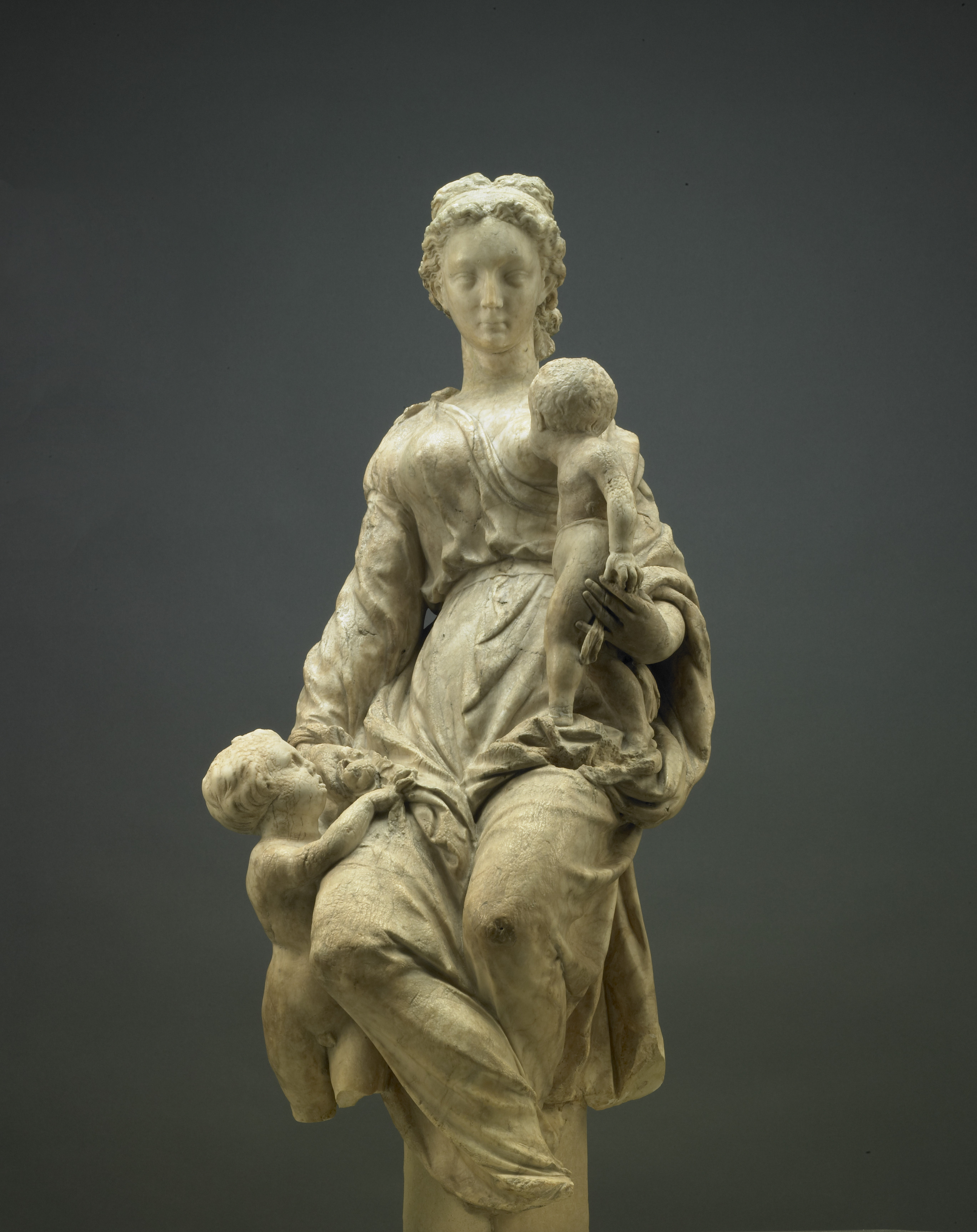 Following the Renaissance convention for representing the virtue of Charity, this artist has presented a beautiful young woman who feeds one child and guides the other. Intricately carved with fine details such as curly hair, delicate facial features, and elegantly folded drapery, this figure is a wonderful example of sculpture produced in the southern Netherlands.