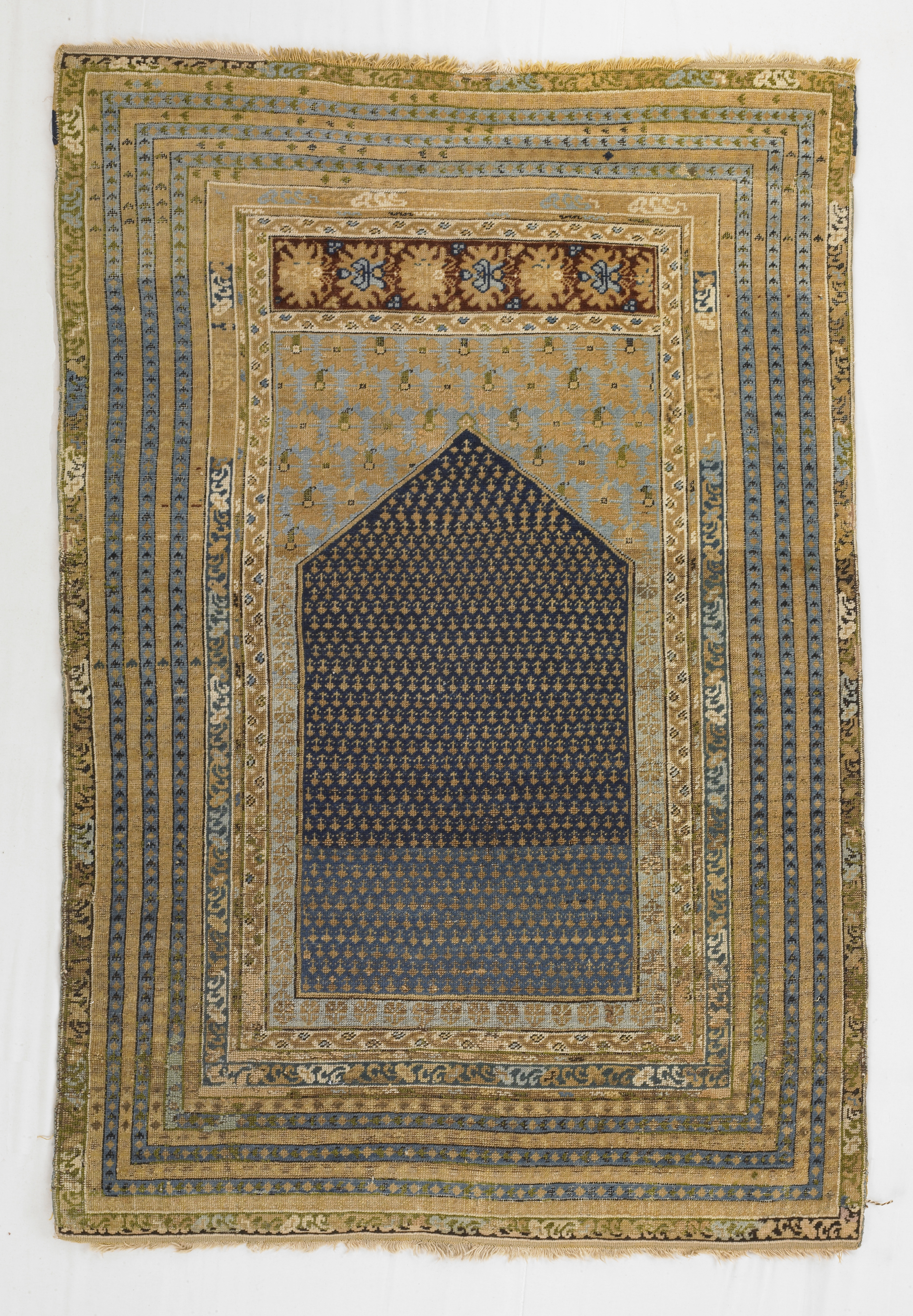 Kula Prayer Carpet with Multiple Borders and Blue Ground with Light Blue Spandrels