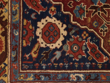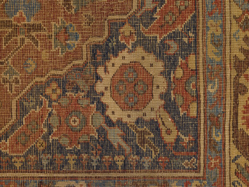 The central field of this carpet reflects the so called “Transylvanian” layout which consists of bilateral symmetry in both vertical and horizontal directions. In keeping with this symmetry, there is a V-shaped prayer niche at both top and bottom. A stylized double lamp hangs from the center of each niche. Many double niche carpets adorned Protestant churches in Transylvania (now central Romania) in the 15th-17th centuries, due to the region’s location on a major East-West trade route, and the high regard for these textiles in the West.