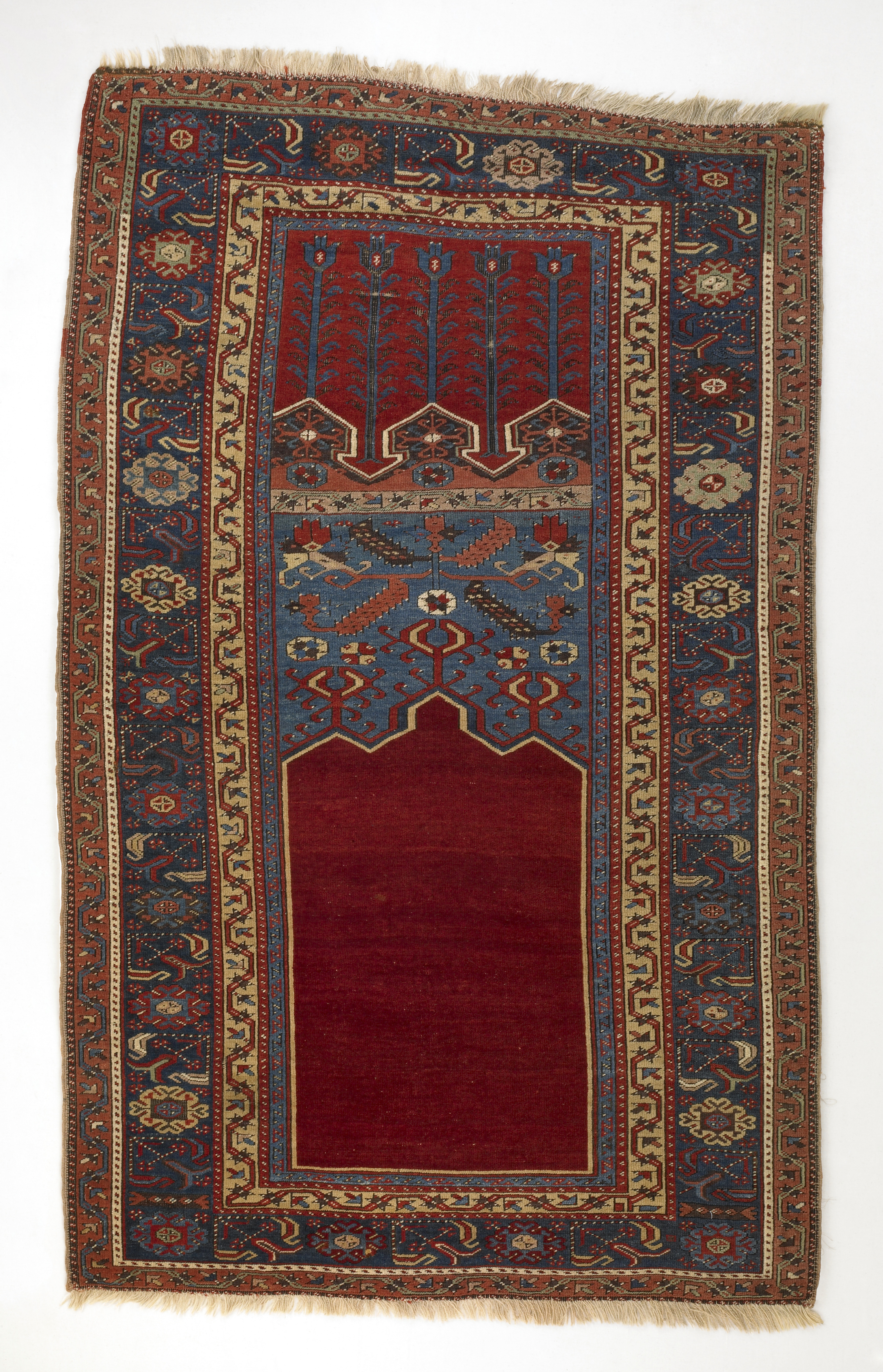 The village of Ladik in central Anatolia (now Turkey) produced rugs in the 18th and 19th centuries featuring regional motifs. Prayer rugs like this one were a Ladik specialty, and early examples were often dated. As a result, scholars could establish an approximate chronology of styles as they developed into the 20th century. Many of the Ladik prayer rugs found in mosques throughout Turkey were probably votive gifts given in the year