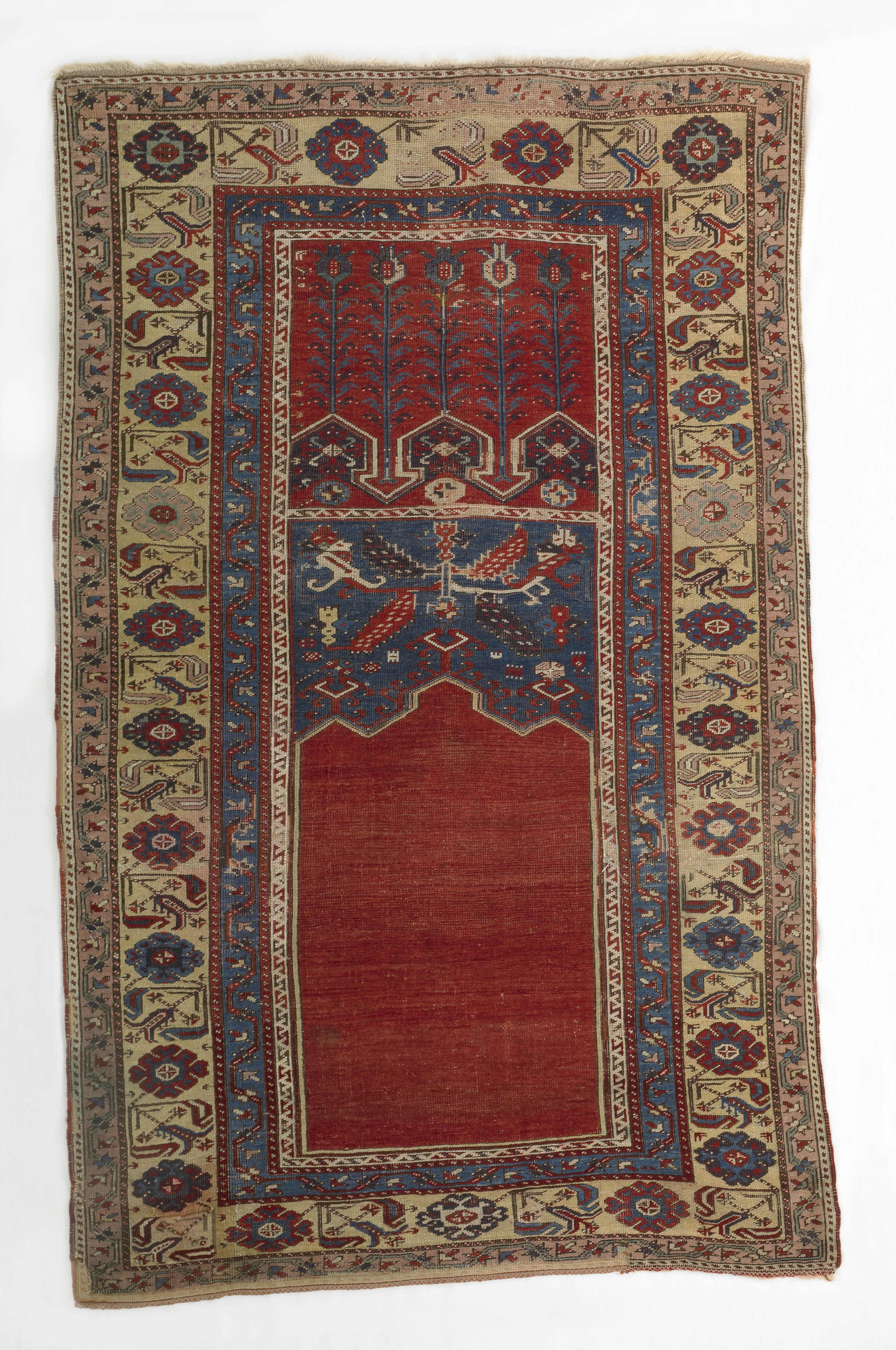 Ladik Prayer Carpet with Vestigial Triple Arch on Red Ground with Yellow Border
