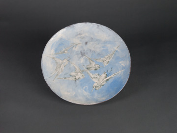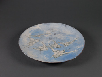 Laura Fry created this image of cranes soaring in a cloud-filled sky-motif inspired by Japanese prints using an impasto of mineral pigments mixed with slip, or thinned clay. When covered with a clear, glossy glaze this painterly technique can achieve the look of oil painting. The process was developed by M. Louise McLaughlin, a china painter from Cincinnati, Ohio. Fry and McLaughlin were early members of the Cincinnati Pottery Club where they perfected the technique. Both artists later worked as decorators at the Rookwood Pottery.