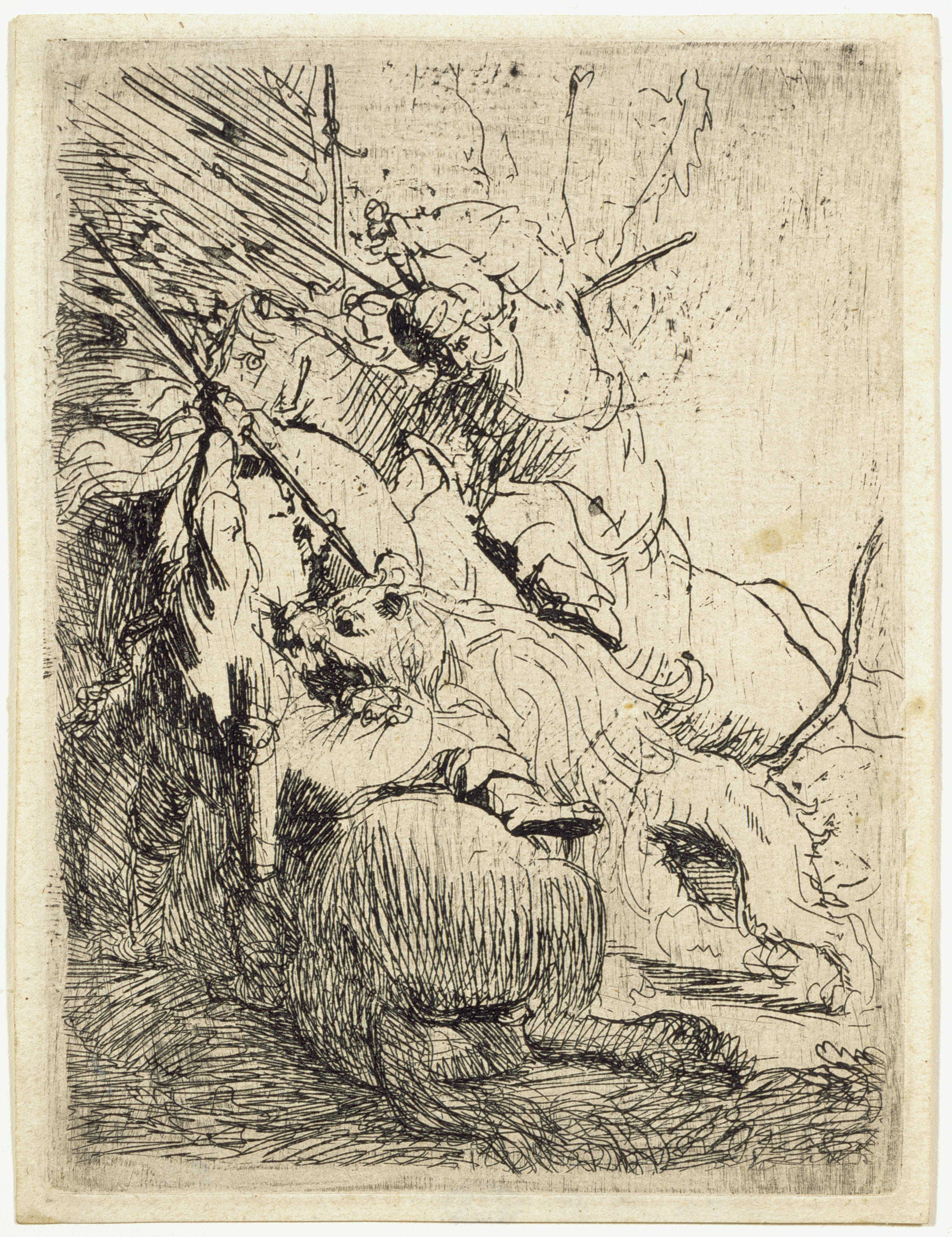 In this lively print, Rembrandt van Rijn illustrated the fierce intensity of a hunt in the lunging lion about to sink its teeth into a fallen horseman, while another man advances to his aid. The artist could have easily removed all the incidental marks that appear throughout the print, and especially at the upper right, but he chose not to; perhaps he felt that the grittiness created by these marks heightened the action and drama of the image.