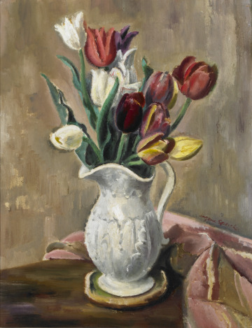 A graceful bouquet of tulips in warm, rich tones echoes the form and patterns of a white, ceramic pitcher. Having established his reputation by the 1920s as a successful portraitist, Eugene Speicher began painting still lifes. A critic enthused over these modest pictures: “His flower subjects are in no way plodding copies of the objects from which he worked; the latter simply suggested to him a color theme which he worked out with a palette of orchestral fullness. . . . Note how the white pitcher acts as a rest in music to give relief from the activity of the color in the blossoms above.”