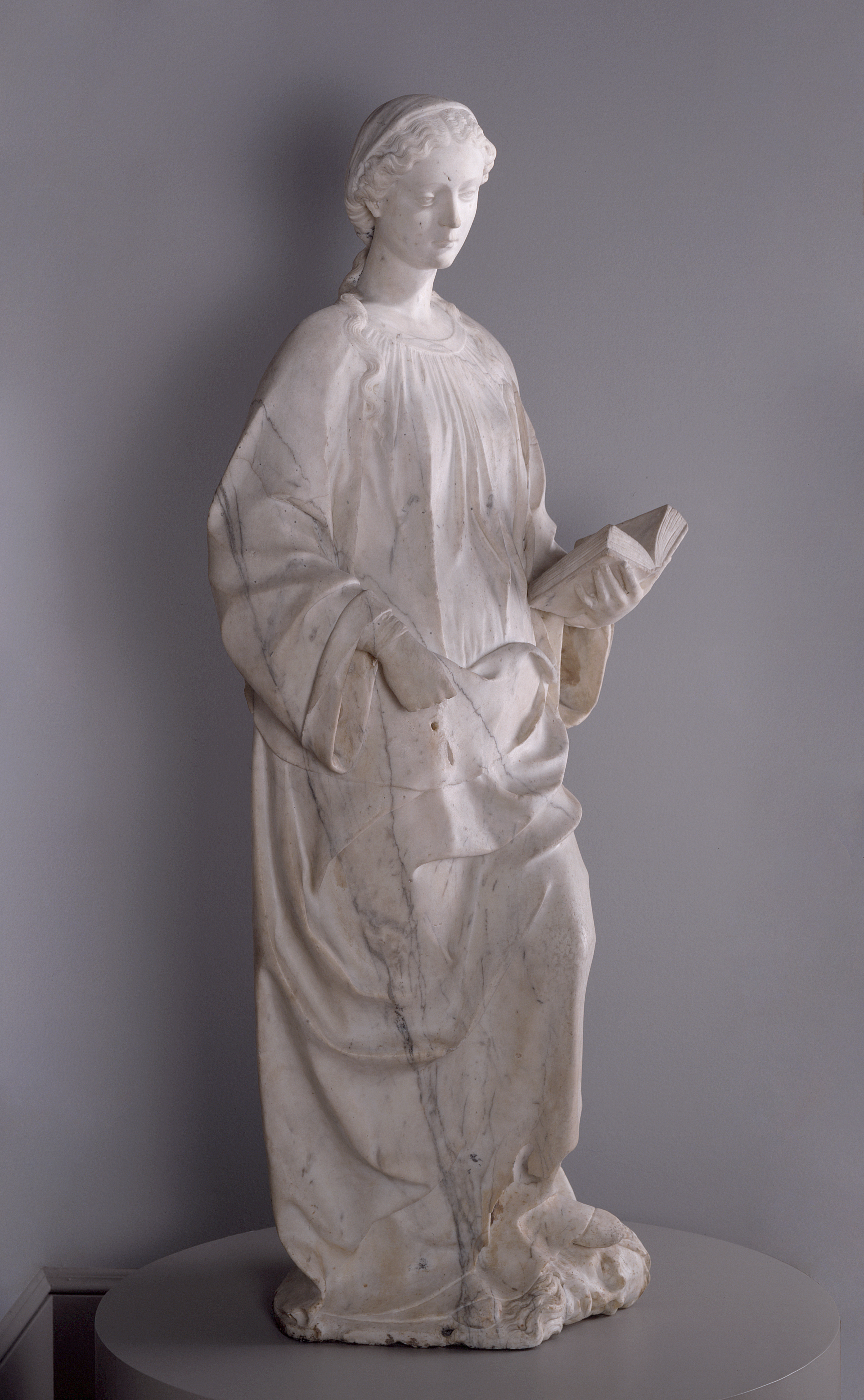 The graceful pose and downcast eyes of this elegant sculpture capture the serene beauty of Catherine of Alexandria, a 4th-century CE saint admired for her learning. Despite an order by Emperor Maximinus (reigned 305–313 CE) to persecute Christians, Catherine continued to preach her faith. Here Catherine tramples the emperor’s head, which conveys her triumph over his orders. The book in her left hand signifies her great intellect; her right hand originally gripped a sword, alluding to her eventual decapitation. This sculpture originally had painted edging along the bottom of Catherine’s gown, a typical motif employed by the Gagini workshop in Sicily.