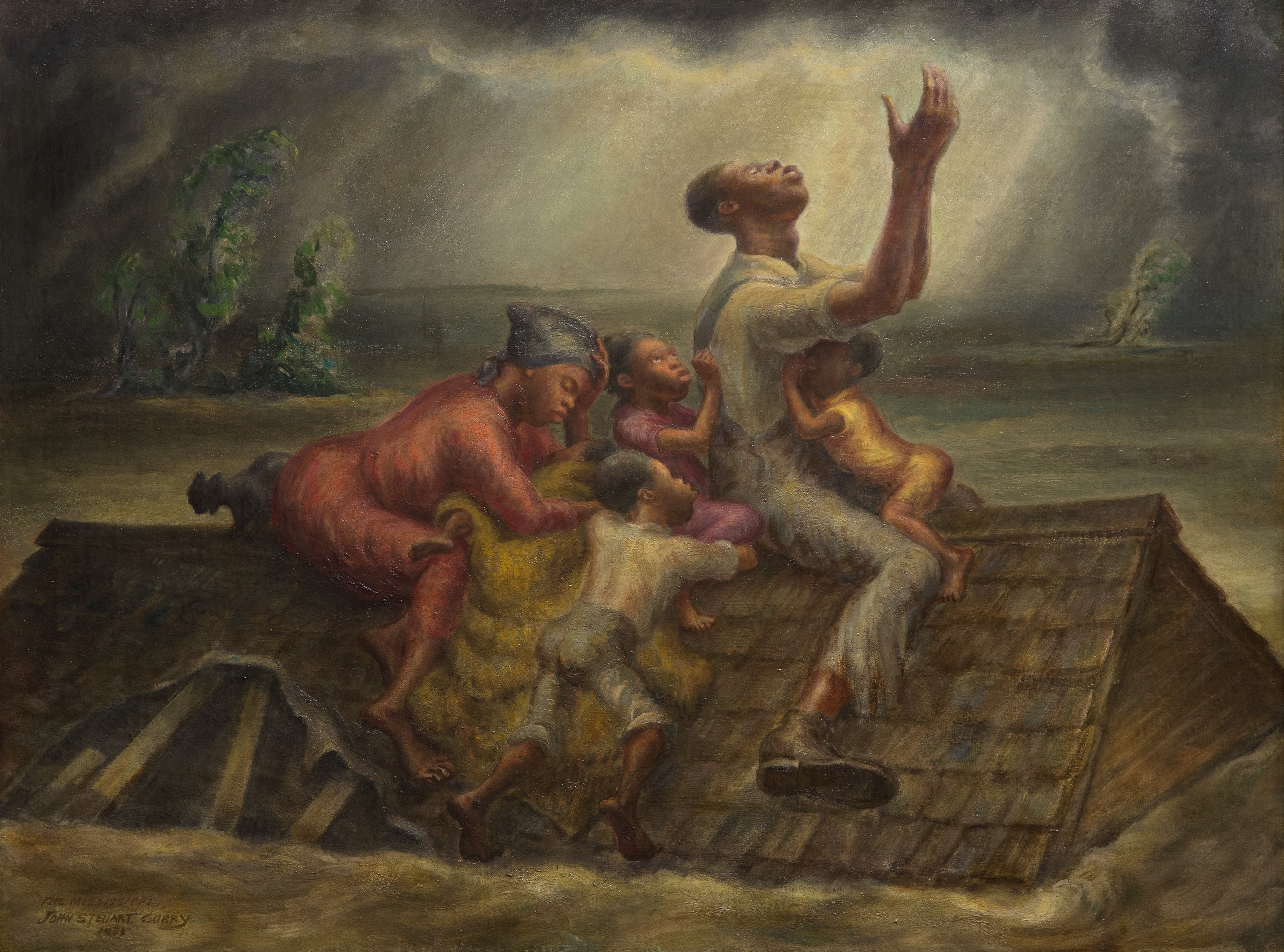 This painting is based on a 1927 flood that was among the nation’s most destructive. It covered 27,000 square miles, displacing over 200,000 African Americans and enlarging the Mississippi River at one point to a width of 60 miles. It was, however, only one of the many floods that plagued the nation’s rural populations in the 1920s and 1930s.