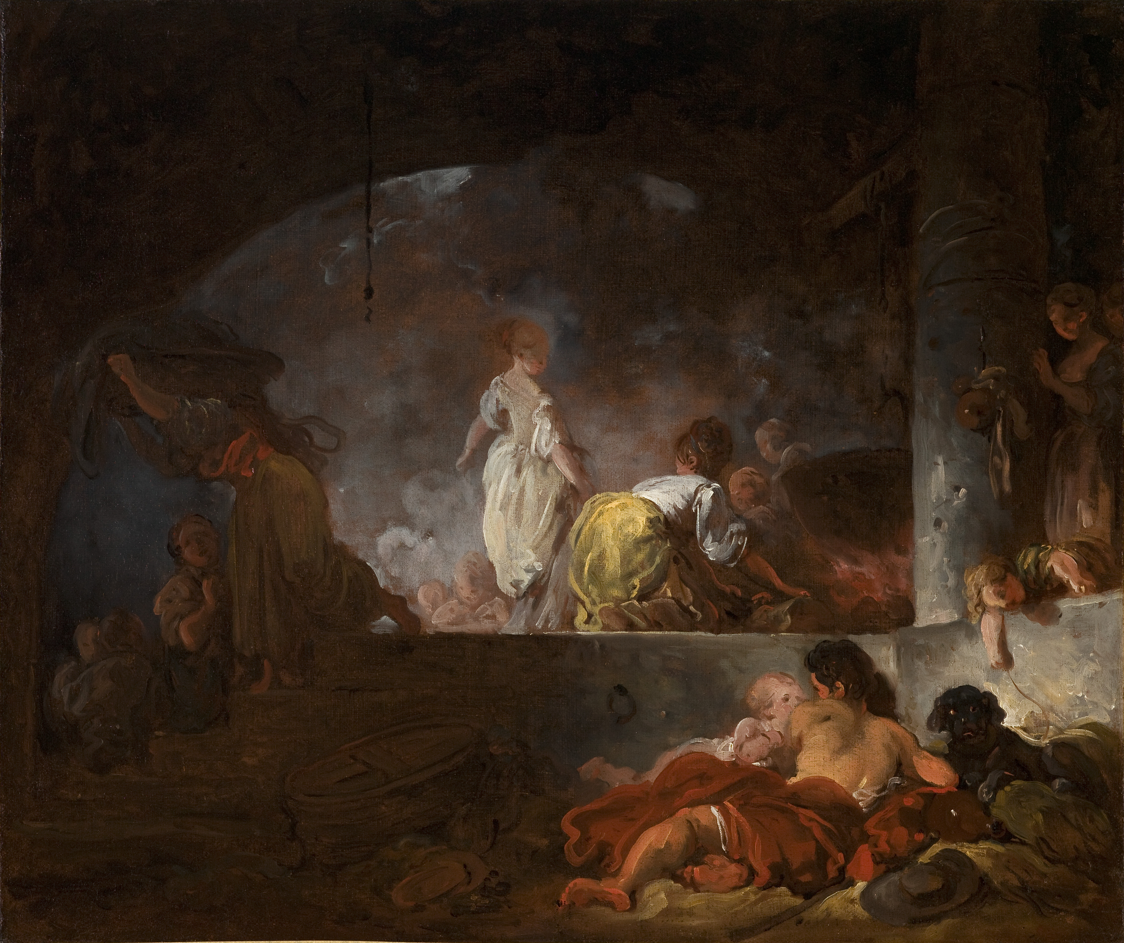 Two women in bright white and yellow form the focal point of this composition. They toil within a stifling atmosphere of dense steam clouds in a laundry. Jean-Honoré Fragonard, a favorite artist at court, often chose working class people as subjects. Here he captures the demanding physical labor that washing required, most notably in the figure carrying a heavy bundle. The artist makes visible the intense heat of the kettle; contemporary laundry treatises recommended a seventeen-hour process with temperatures near boiling.