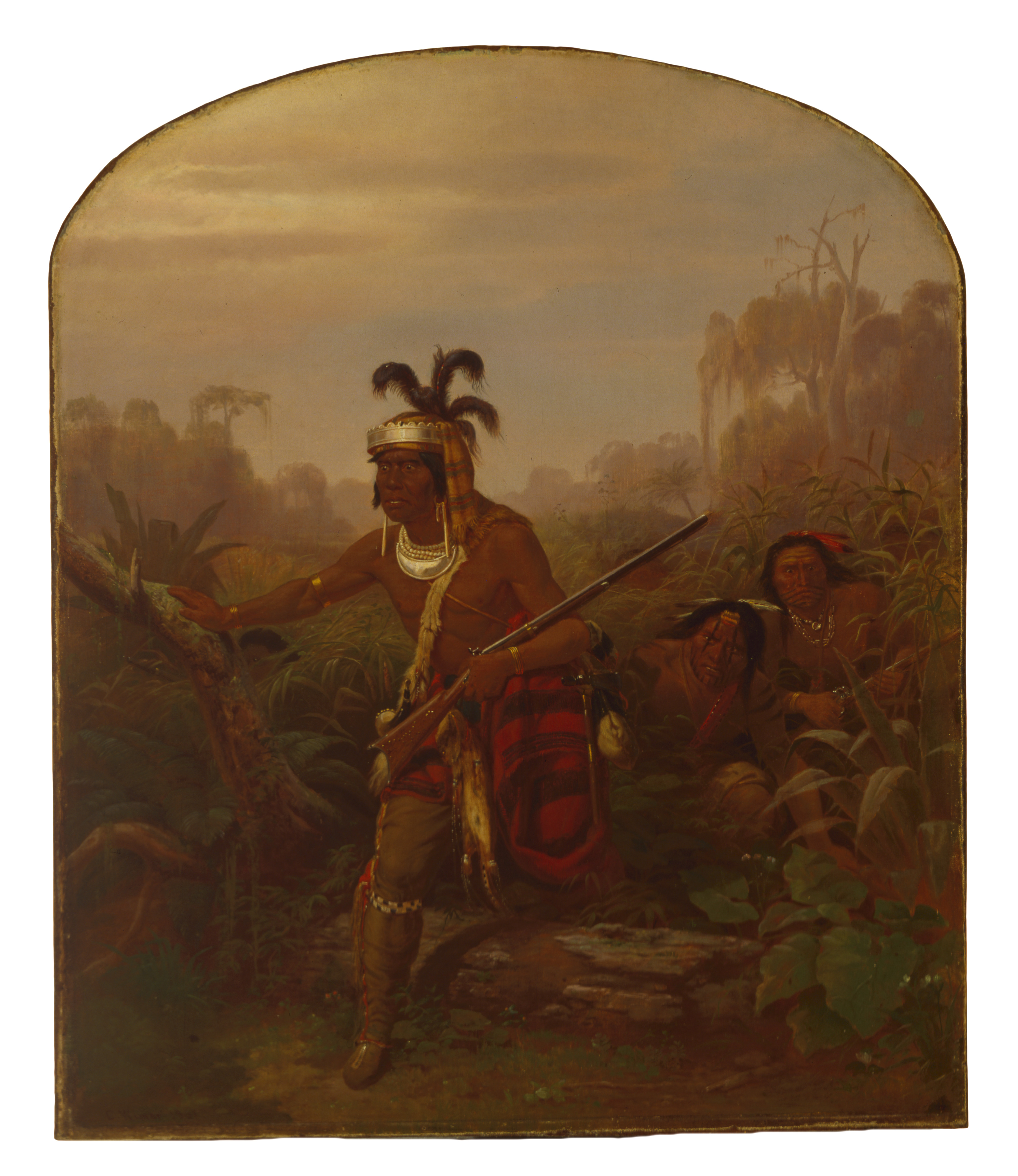 Charles Ferdinand Wimar portrays the Seminole chief Billy Bowlegs (Holata Micco) with a group of men, advancing through the dense vegetation of the Florida Everglades. During the mid-nineteenth century, Holata Micco became well-known due to his role as a leader during the Third Seminole War, and images of him were circulated in popular publications. Wimar used these images as a basis for Holata Micco’s facial features and headdress, while editing his attire to conform to 19th-century stereotypes of Native Americans.