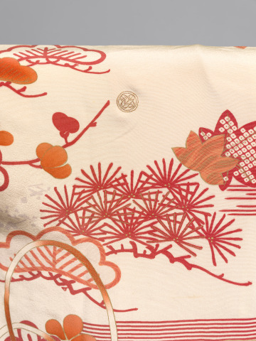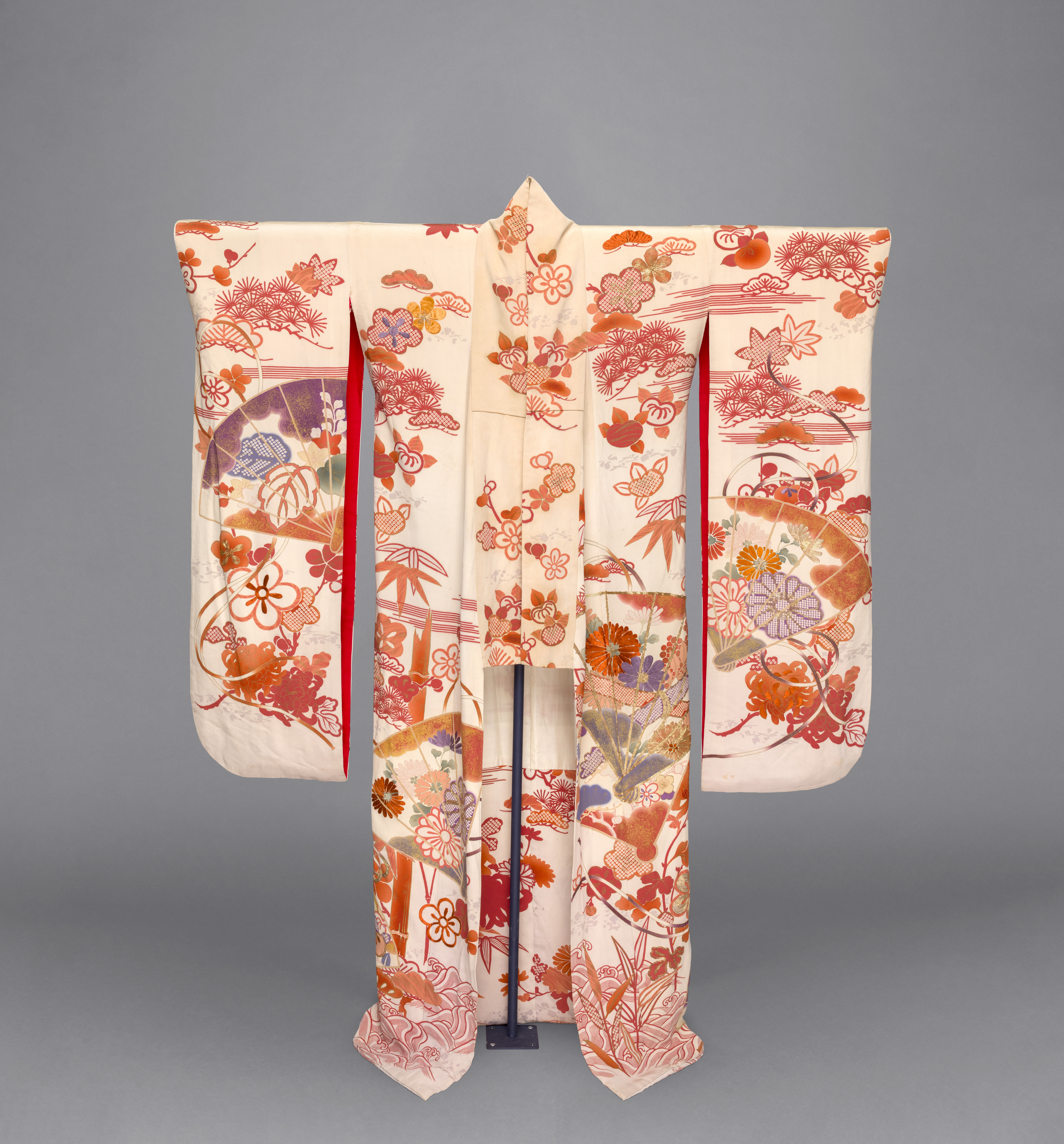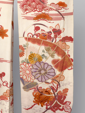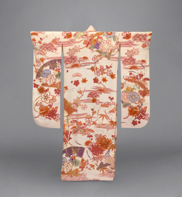 Woman’s Long-sleeved Robe (furisode) with Design of Autumnal Flowers, Leaves, Fans, and Waves